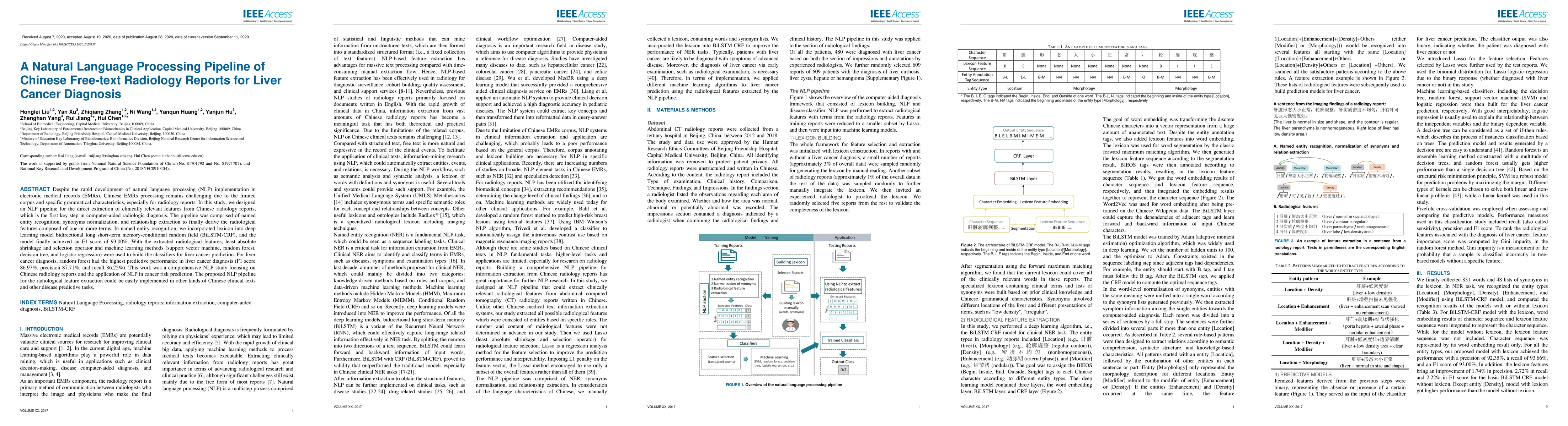This study developed an NLP pipeline for extracting clinically relevant features from Chinese radiology reports to aid liver cancer diagnosis. The pipeline achieved high accuracy in named entity recognition and used machine learning classifiers, with the random forest model showing the best performance in liver cancer prediction.