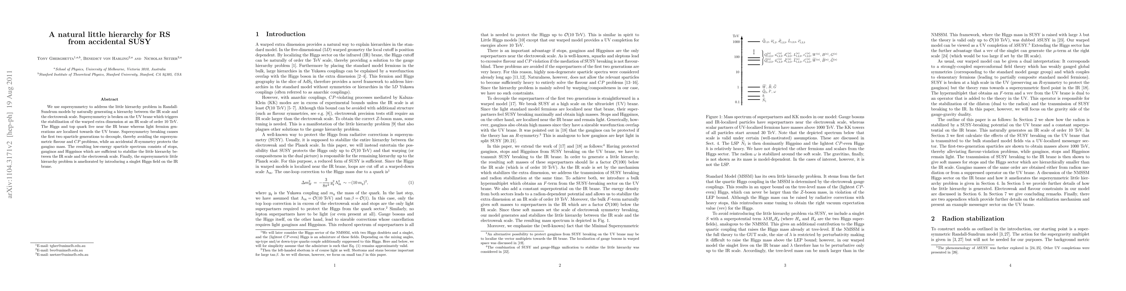 We use supersymmetry to address the little hierarchy problem in Randall-Sundrum models by naturally generating a hierarchy between the IR scale and the electroweak scale. Supersymmetry is broken on the UV brane which triggers the stabilization of the warped extra dimension at an IR scale of order 10 TeV. The Higgs and top quark live near the IR brane whereas light fermion generations are localized towards the UV brane. Supersymmetry breaking causes the first two sparticle generations to decouple, thereby avoiding the supersymmetric flavour and CP problems, while an accidental R-symmetry protects the gaugino mass. The resulting low-energy sparticle spectrum consists of stops, gauginos and Higgsinos which are sufficient to stabilize the little hierarchy between the IR scale and the electroweak scale. Finally, the supersymmetric little hierarchy problem is ameliorated by introducing a singlet Higgs field on the IR brane.