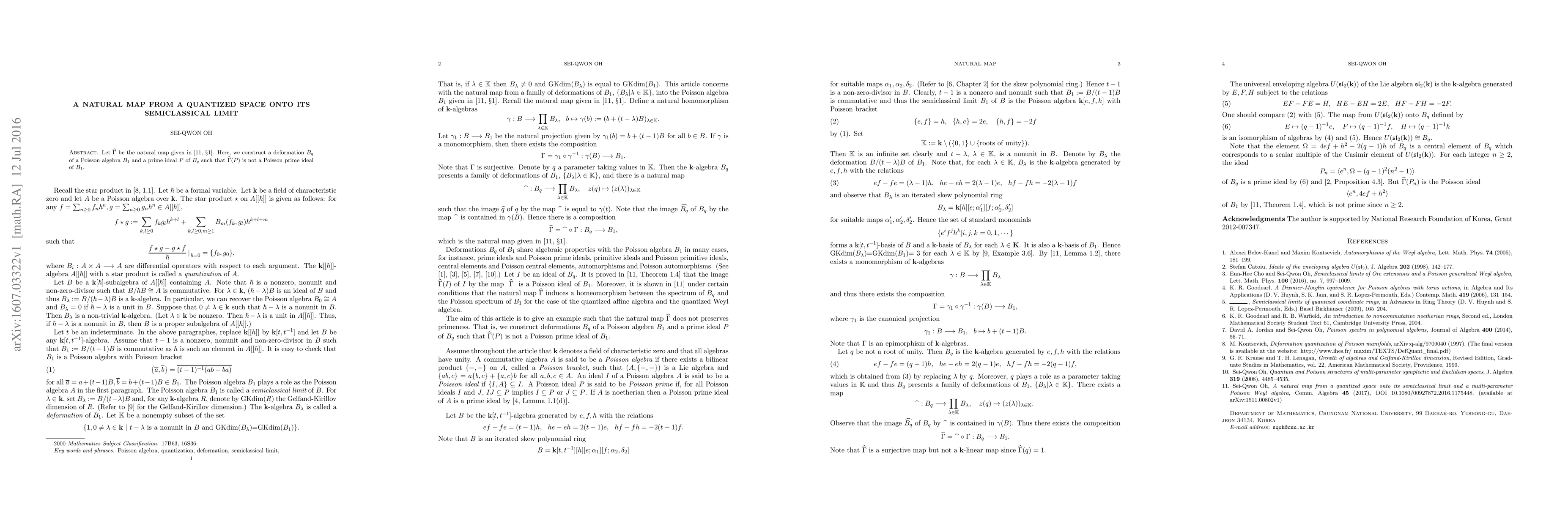 Let $\widehat{\Gamma}$ be the natural map given in \cite[\S1]{Oh12}. Here, we construct a deformation $B_q$ of a Poisson algebra $B_1$ and a prime ideal $P$ of $B_q$ such that $\widehat{\Gamma}(P)$ is not a Poisson prime ideal of $B_1$.