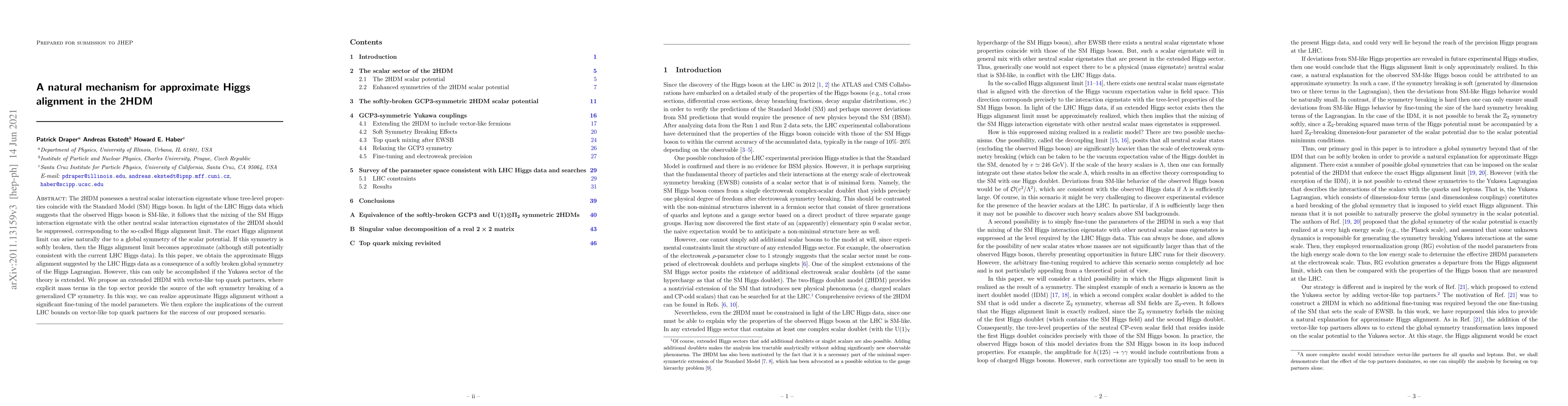 This paper proposes an extended 2HDM with vector-like top quark partners to achieve approximate Higgs alignment, consistent with LHC data, by softly breaking a global symmetry in the Higgs Lagrangian. It explores the implications of current LHC constraints on these vector-like partners.