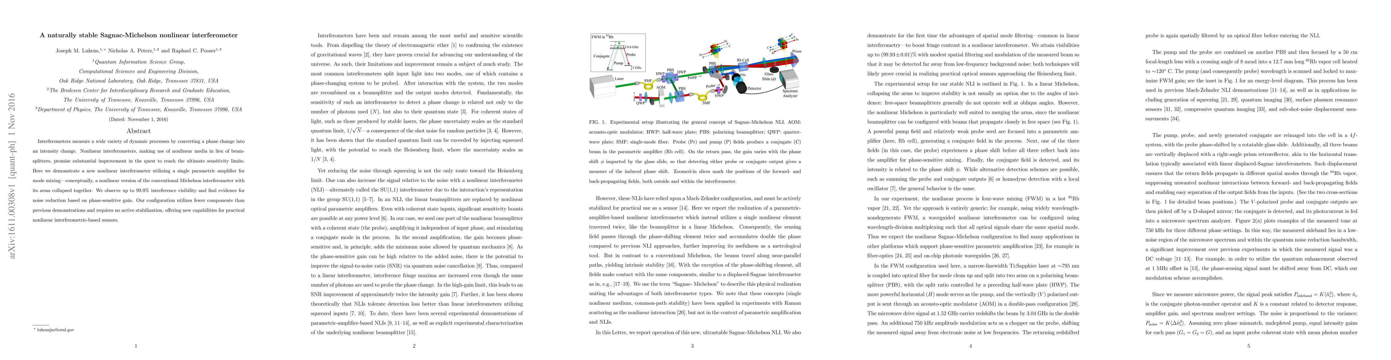 Interferometers measure a wide variety of dynamic processes by converting a phase change into an intensity change. Nonlinear interferometers, making use of nonlinear media in lieu of beamsplitters, promise substantial improvement in the quest to reach the ultimate sensitivity limits. Here we demonstrate a new nonlinear interferometer utilizing a single parametric amplifier for mode mixing---conceptually, a nonlinear version of the conventional Michelson interferometer with its arms collapsed together. We observe up to 99.9\% interference visibility and find evidence for noise reduction based on phase-sensitive gain. Our configuration utilizes fewer components than previous demonstrations and requires no active stabilization, offering new capabilities for practical nonlinear interferometric-based sensors.