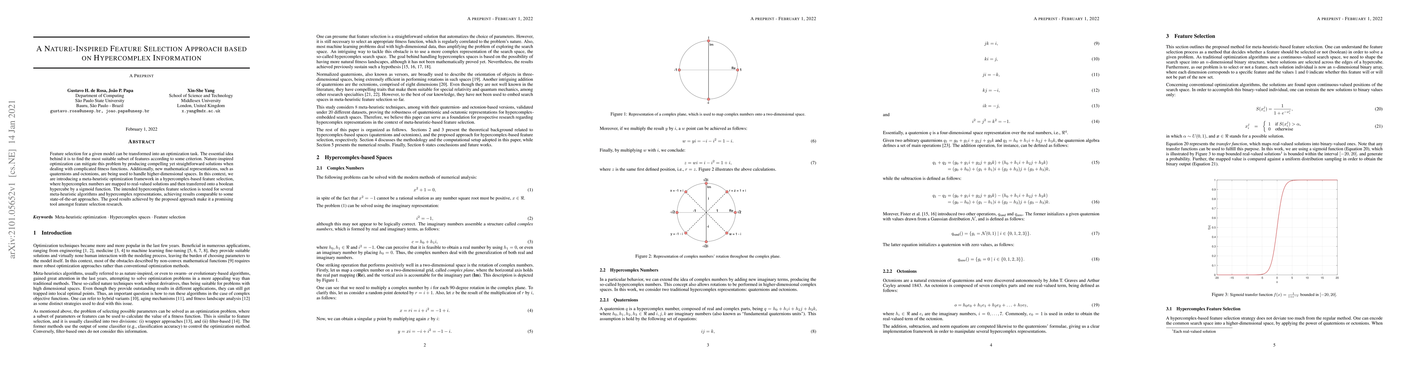 This paper proposes a novel nature-inspired feature selection method using hypercomplex numbers, mapping them to real-valued solutions and applying a sigmoid function to a boolean hypercube. The results are competitive with state-of-the-art approaches, indicating its potential as a promising tool in feature selection research.