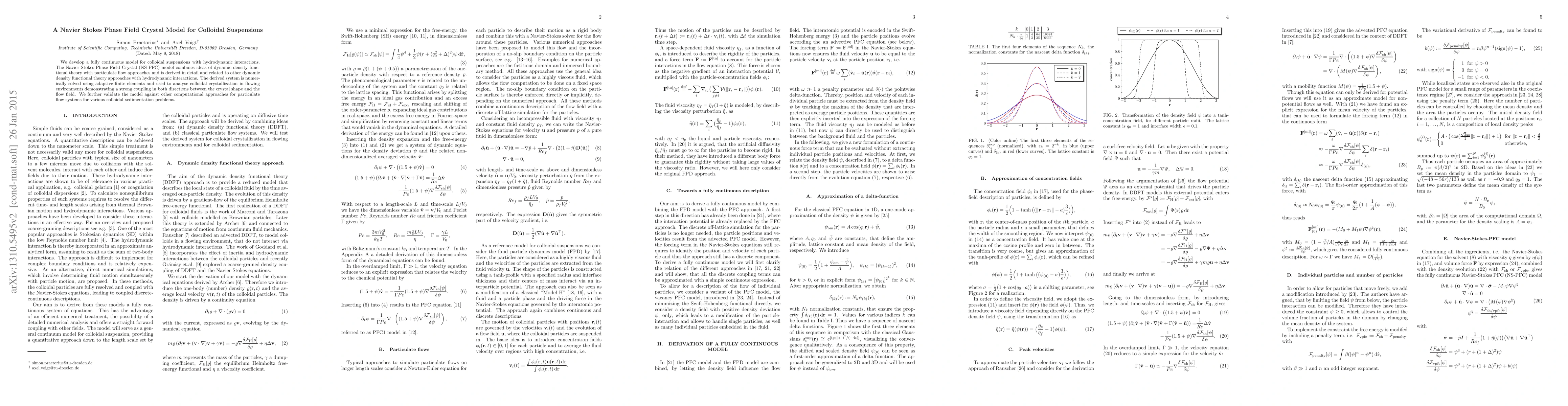 We develop a fully continuous model for colloidal suspensions with hydrodynamic interactions. The Navier Stokes Phase Field Crystal (NS-PFC) model combines ideas of dynamic density functional theory with particulate flow approaches and is derived in detail and related to other dynamic density functional theory approaches with hydrodynamic interactions. The derived system is numerically solved using adaptive finite elements and used to analyse colloidal crystallization in flowing environments demonstrating a strong coupling in both directions between the crystal shape and the flow field. We further validate the model against other computational approaches for particulate flow systems for various colloidal sedimentation problems.