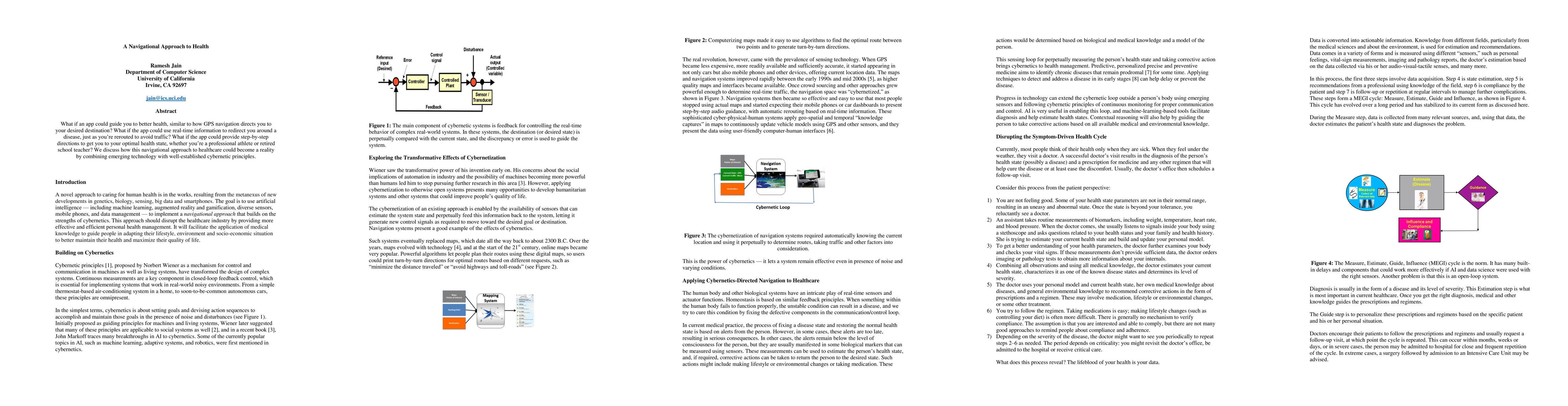 What if an app could guide you to better health, similar to how GPS navigation directs you to your desired destination? What if the app could use real-time information to redirect you around a disease, just as you're rerouted to avoid traffic? What if the app could provide step-by-step directions to get you to your optimal health state, whether you're a professional athlete or retires school teacher? We discuss how this navigational approach to healthcare could become a reality by combining technology with well-established cybernetics principles.
