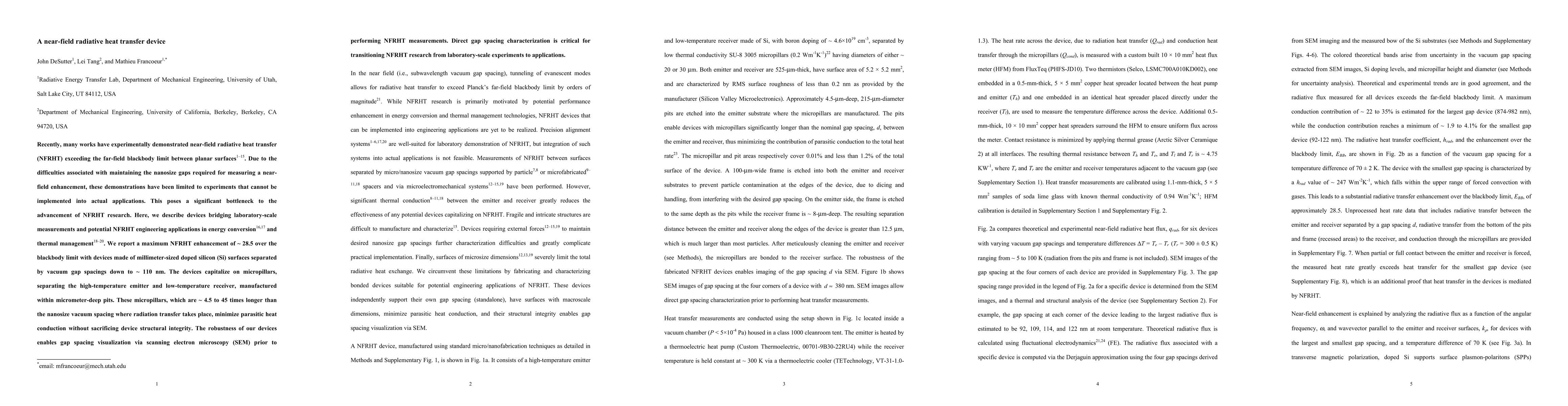 Recently, many works have experimentally demonstrated near-field radiative heat transfer (NFRHT) exceeding the far-field blackbody limit between planar surfaces. Due to the difficulties associated with maintaining the nanosize gaps required for measuring a near-field enhancement, these demonstrations have been limited to experiments that cannot be implemented into actual applications. This poses a significant bottleneck to the advancement of NFRHT research. Here, we describe devices bridging laboratory-scale measurements and potential NFRHT engineering applications in energy conversion and thermal management. We report a maximum NFRHT enhancement of ~ 28.5 over the blackbody limit with devices made of millimeter-sized doped silicon (Si) surfaces separated by vacuum gap spacings down to ~ 110 nm. The devices capitalize on micropillars, separating the high-temperature emitter and low-temperature receiver, manufactured within micrometer-deep pits. These micropillars, which are ~ 4.5 to 45 times longer than the nanosize vacuum spacing where radiation transfer takes place, minimize parasitic heat conduction without sacrificing device structural integrity. The robustness of our devices enables gap spacing visualization via scanning electron microscopy (SEM) prior to performing NFRHT measurements. Direct gap spacing characterization is critical for transitioning NFRHT research from laboratory-scale experiments to applications.