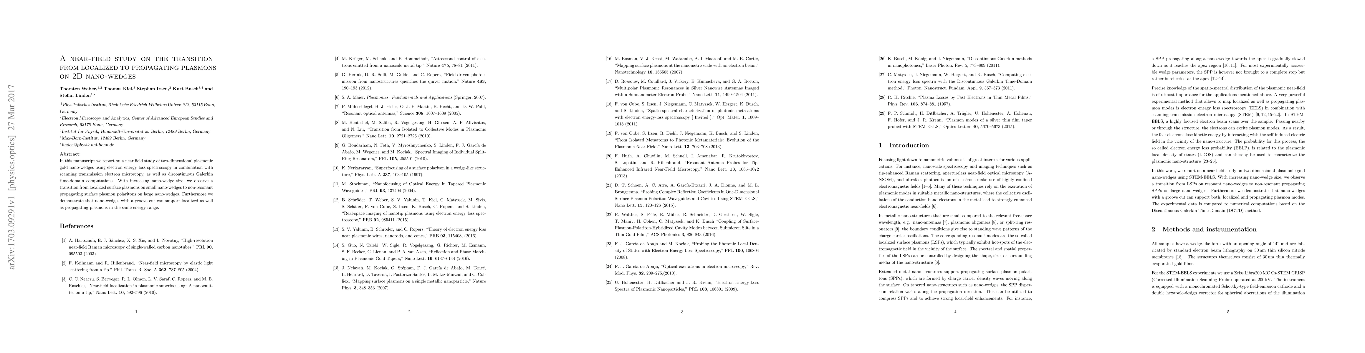 In this manuscript we report on a near-feld study of two-dimensional plasmonic gold nano-wedges using electron energy loss spectroscopy in combination with scanning transmission electron microscopy, as well as discontinuous Galerkin time-domain computations. With increasing nano-wedge size, we observe a transition from localized surface plasmons on small nano-wedges to non-resonant propagating surface plasmon polaritons on large nano-wedges. Furthermore we demonstrate that nano-wedges with a groove cut can support localized as well as propagating plasmons in the same energy range.