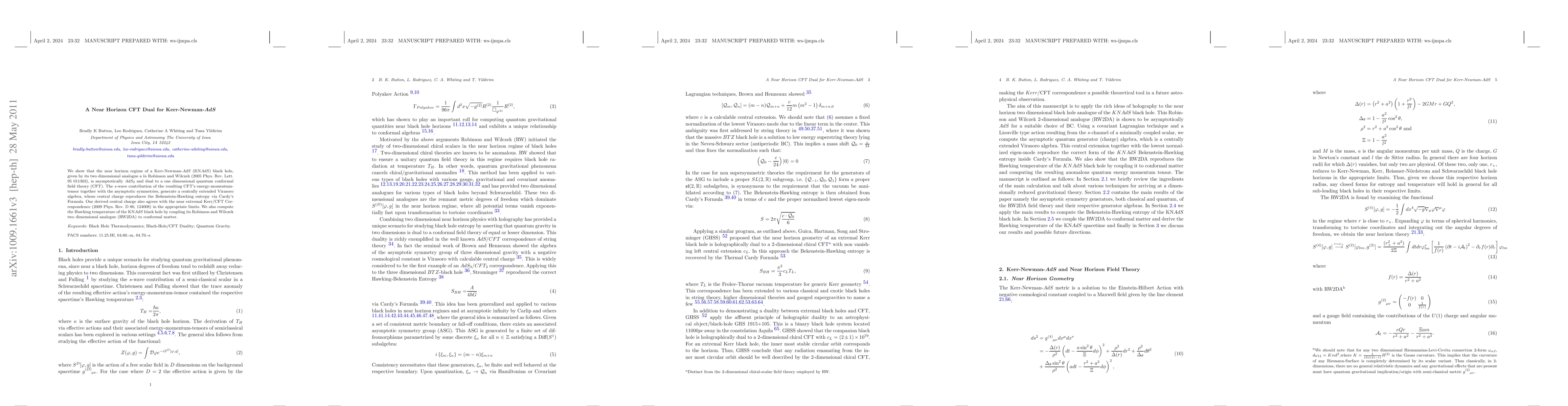 We show that the near horizon regime of a Kerr-Newman-$AdS$ (KN$AdS$) black hole, given by its two dimensional analogue $a la$ Robinson and Wilczek (2005 Phys. Rev. Lett. 95 011303), is asymptotically $AdS_2$ and dual to a one dimensional quantum conformal field theory (CFT). The s-wave contribution of the resulting CFT's energy-momentum-tensor together with the asymptotic symmetries, generate a centrally extended Virasoro algebra, whose central charge reproduces the Bekenstein-Hawking entropy via Cardy's Formula. Our derived central charge also agrees with the near extremal Kerr/CFT Correspondence (2009 Phys. Rev. D 80, 124008) in the appropriate limits. We also compute the Hawking temperature of the KN$AdS$ black hole by coupling its Robinson and Wilczek two dimensional analogue (RW2DA) to conformal matter.