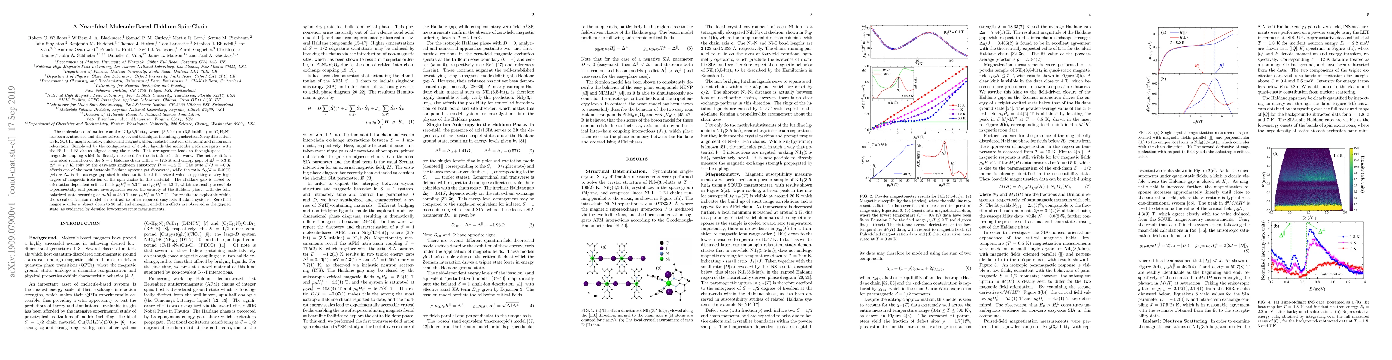 The molecular coordination complex NiI$_2$(3,5-lut)$_4$ [where (3,5-lut) $=$ (3,5-lutidine) $=$ (C$_7$H$_9$N)] has been synthesized and characterized by several techniques including synchrotron X-ray diffraction, ESR, SQUID magnetometry, pulsed-field magnetization, inelastic neutron scattering and muon spin relaxation. Templated by the configuration of 3,5-lut ligands the molecules pack in-registry with the Ni--I$\cdots$I--Ni chains aligned along the $c$--axis. This arrangement leads to through-space I$\cdots$I magnetic coupling which is directly measured for the first time in this work. The net result is a near-ideal realization of the $S = 1$ Haldane chain with $J = 17.5~\rm{K}$ and energy gaps of $\Delta^{\parallel} = 5.3~{\rm K}$ $\Delta^{\perp} =7.7~{\rm K}$, split by the easy-axis single-ion anisotropy $D=-1.2~{\rm K}$. The ratio $D/J = -0.07$ affords one of the most isotropic Haldane systems yet discovered, while the ratio $\Delta_0/J = 0.40(1)$ (where $\Delta_0$ is the average gap size) is close to its ideal theoretical value, suggesting a very high degree of magnetic isolation of the spin chains in this material. The Haldane gap is closed by orientation-dependent critical fields $\mu_0H_{\rm c}^{\parallel} = 5.3~\rm{T}$ and $\mu_0H_{\rm c}^{\perp} = 4.3~\rm{T}$, which are readily accessible experimentally and permit investigations across the entirety of the Haldane phase, with the fully polarized state occurring at $\mu_0 H_{\rm s}^{\parallel}=46.0~\rm{T}$ and $\mu_0 H_{\rm s}^{\perp}=50.7~\rm{T}$. The results are explicable within the so-called fermion model, in contrast to other reported easy-axis Haldane systems. Zero-field magnetic order is absent down to $20~{\rm mK}$ and emergent end-chain effects are observed in the gapped state, as evidenced by detailed low-temperature measurements.