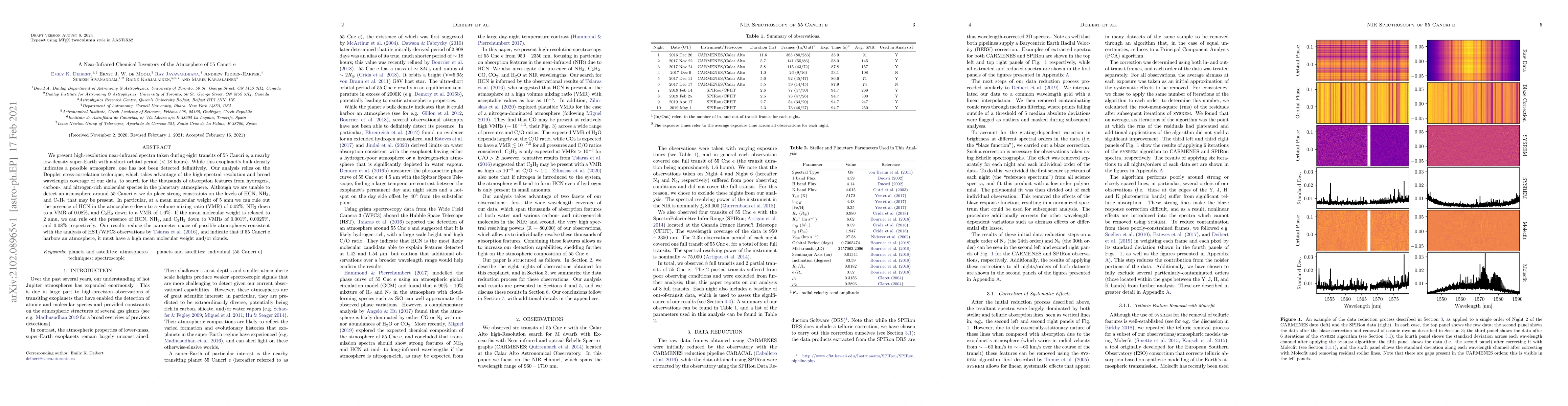 This study uses high-resolution near-infrared spectra from eight transits of 55 Cancri e to search for atmospheric molecules but finds no definitive evidence of an atmosphere. The analysis places strong constraints on the presence of HCN, NH$_3$, and C$_2$H$_2$, ruling them out at specific volume mixing ratios, suggesting any atmosphere must have a high mean molecular weight or contain clouds.