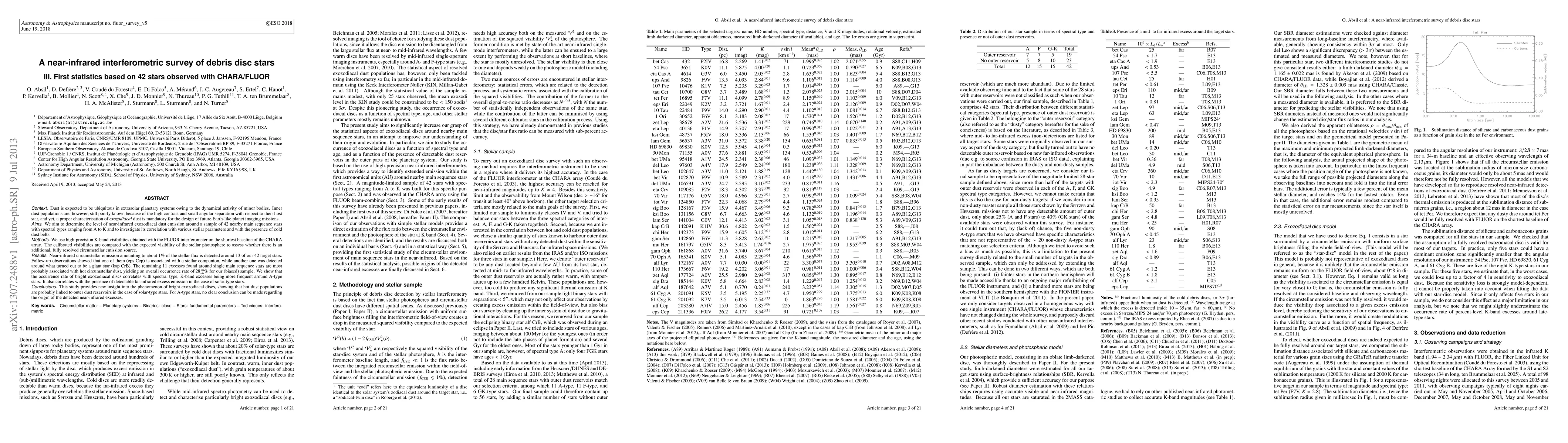 This study uses near-infrared interferometry to detect exozodiacal dust around 42 nearby main sequence stars, finding circumstellar emission in about 28% of cases. The occurrence rate correlates with spectral type and the presence of far-infrared excess, suggesting links to outer dust reservoirs for solar-type stars.
