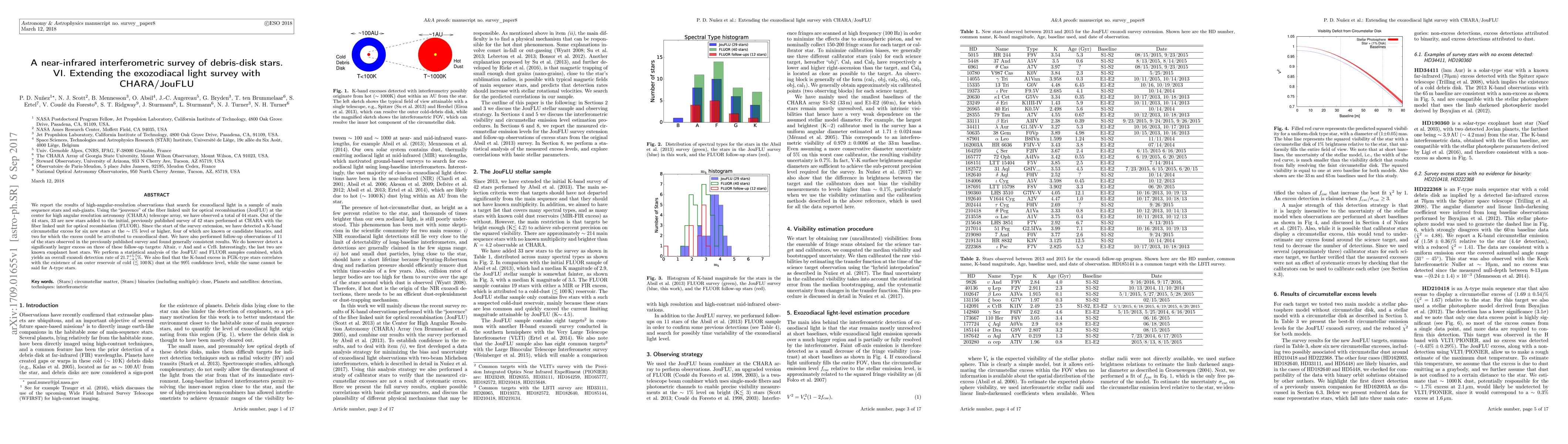 This study reports high-resolution observations of 44 main sequence stars and sub-giants using the CHARA telescope's JouFLU instrument, detecting exozodiacal dust around six new stars. Follow-up observations of previous targets show a higher excess in three, including two exoplanet host stars. The combined analysis yields a detection rate of 21.7%, with a strong correlation between K-band excess and cold dust in FGK-type stars.