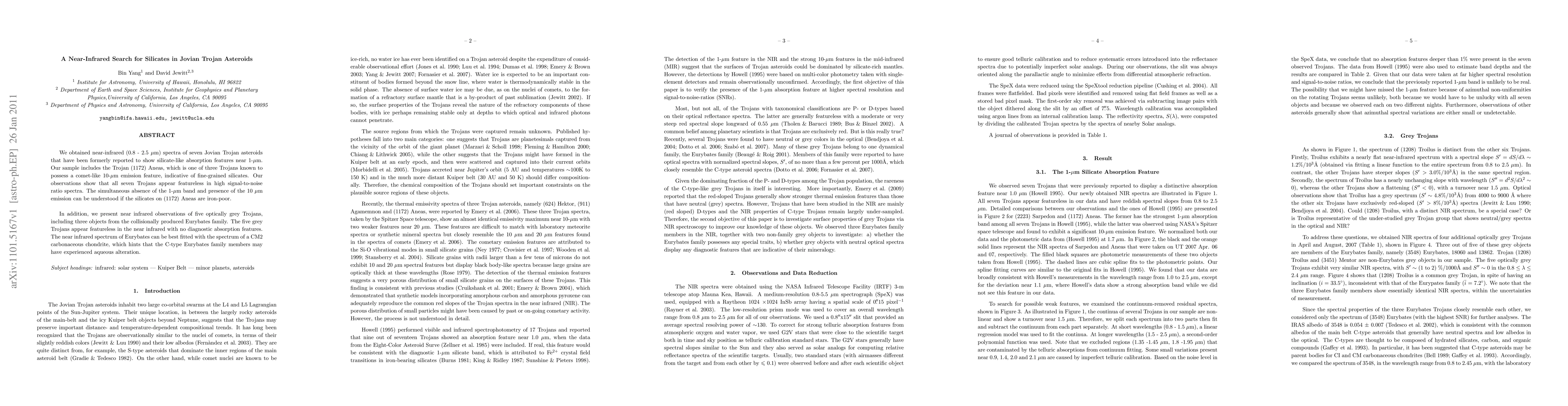 This study obtained near-infrared spectra of seven Jovian Trojan asteroids, finding no silicate-like absorption features, suggesting iron-poor silicates on (1172) Aneas. Additionally, five grey Trojans, including Eurybates family members, also showed no diagnostic features, with Eurybates possibly having experienced aqueous alteration akin to CM2 carbonaceous chondrites.