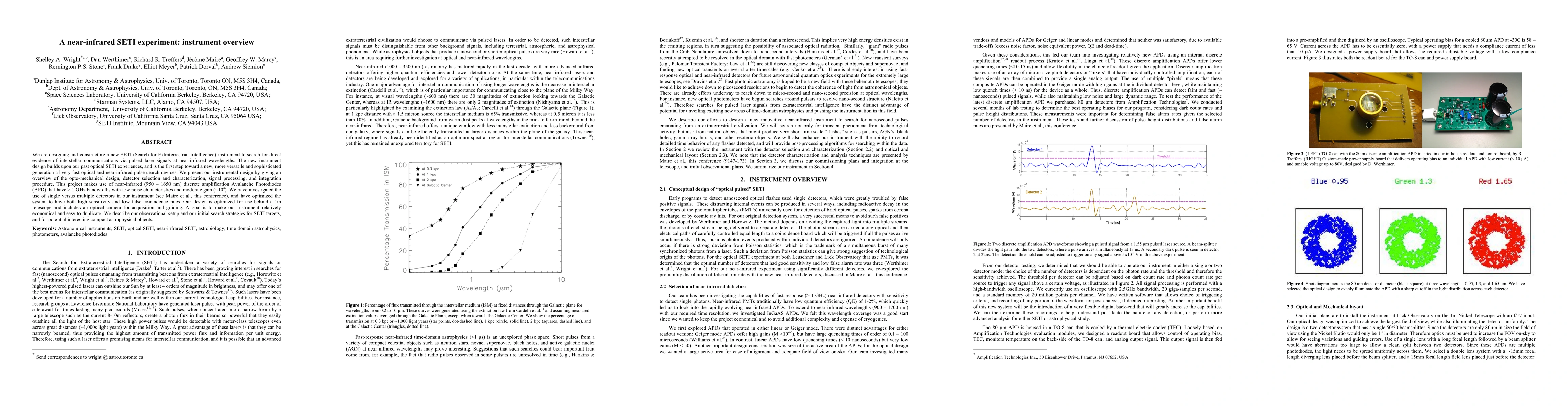 We are designing and constructing a new SETI (Search for Extraterrestrial Intelligence) instrument to search for direct evidence of interstellar communications via pulsed laser signals at near-infrared wavelengths. The new instrument design builds upon our past optical SETI experiences, and is the first step toward a new, more versatile and sophisticated generation of very fast optical and near-infrared pulse search devices. We present our instrumental design by giving an overview of the opto-mechanical design, detector selection and characterization, signal processing, and integration procedure. This project makes use of near-infrared (950-1650 nm) discrete amplification Avalanche Photodiodes (APD) that have greater than 1 GHz bandwidths with low noise characteristics and moderate gain (~10^4). We have investigated the use of single versus multiple detectors in our instrument (see Maire et al., this conference), and have optimized the system to have both high sensitivity and low false coincidence rates. Our design is optimized for use behind a 1m telescope and includes an optical camera for acquisition and guiding. A goal is to make our instrument relatively economical and easy to duplicate. We describe our observational setup and our initial search strategies for SETI targets, and for potential interesting compact astrophysical objects.