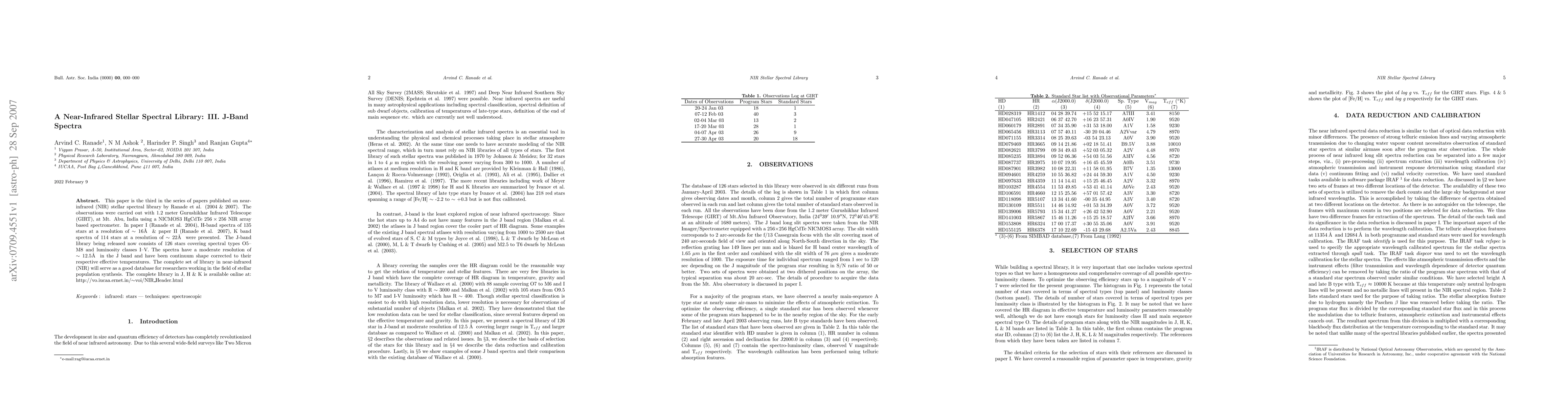 This paper is the third in the series of papers published on near-infrared (NIR) stellar spectral library by Ranade et al. (2004 & 2007). The observations were carried out with 1.2 meter Gurushikhar Infrared Telescope (GIRT), at Mt. Abu, India using a NICMOS3 HgCdTe $256 \times 256$ NIR array based spectrometer. In paper I (Ranade et al. 2004), H-band spectra of 135 stars at a resolution of $\sim 16$\AA & paper II (Ranade et al. 2007), K band spectra of 114 stars at a resolution of $\sim 22$\AA were presented. The J-band library being released now consists of 126 stars covering spectral types O5--M8 and luminosity classes I--V. The spectra have a moderate resolution of $\sim 12.5$\AA in the J band and have been continuum shape corrected to their respective effective temperatures. The complete set of library in near-infrared (NIR) will serve as a good database for researchers working in the field of stellar population synthesis. The complete library in J, H & K is available online at: http://vo.iucaa.ernet.in/$\sim$voi/NIR\_Header.html