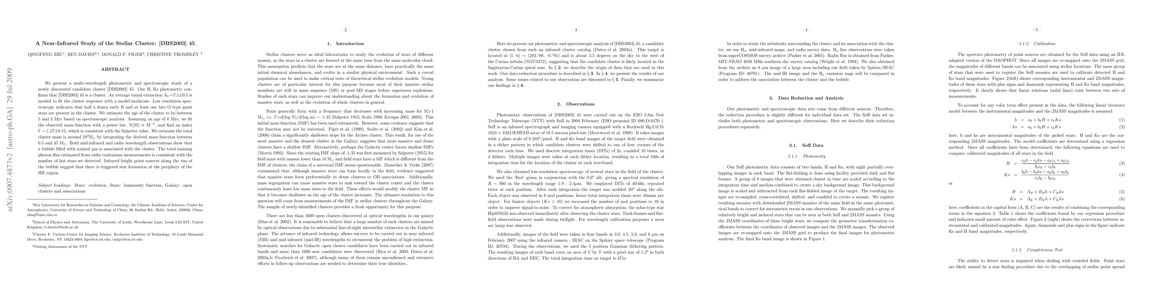 We present a multi-wavelength photometric and spectroscopic study of a newly discovered candidate cluster [DBS2003] 45. Our H, Ks photometry confirms that [DBS2003] 45 is a cluster. An average visual extinction Av 7.1+/-0.5 is needed to fit the cluster sequence with a model isochrone. Low resolution spectroscopy indicates that half a dozen early B and at least one late O type giant stars are present in the cluster. We estimate the age of the cluster to be between 5 and 8 Myr based on spectroscopic analysis. Assuming an age of 6 Myr, we fit the observed mass function with a power law, N(M) M^(-Gamma), and find an index Gamma 1.27+/-0.15, which is consistent with the Salpeter value. We estimate the total cluster mass is around 1000 solar masses by integrating the derived mass function between 0.5 and 45 solar masses. Both mid-infrared and radio wavelength observations show that a bubble filled with ionized gas is associated with the cluster. The total ionizing photon flux estimated from radio continuum measurements is consistent with the number of hot stars we detected. Infrared bright point sources along the rim of the bubble suggest that there is triggered star formation at the periphery of the HII region.