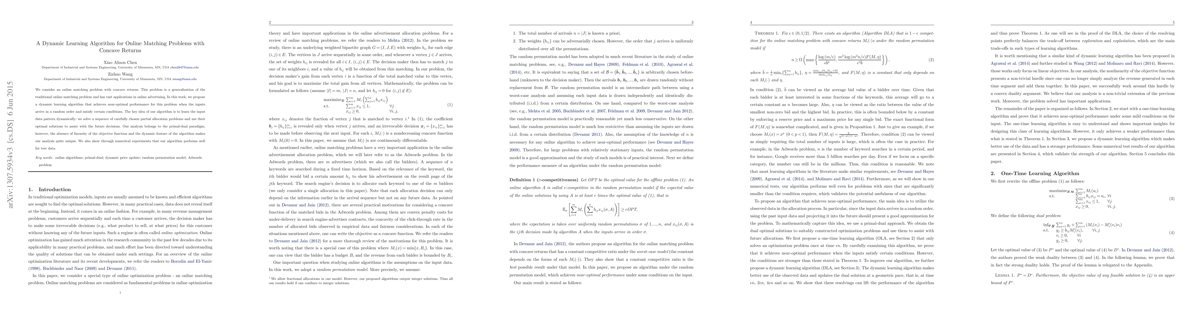 This paper proposes a near-optimal dynamic learning algorithm for online matching problems with concave returns, generalizing the Adwords allocation problem. The algorithm dynamically learns input data patterns by solving a sequence of partial allocation problems to assist future decisions, achieving near-optimal performance under random bid order and specific input conditions.