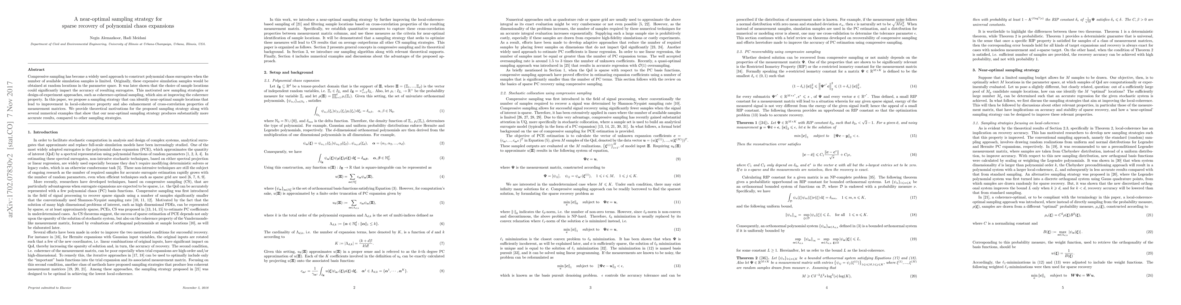 This paper proposes a near-optimal sampling strategy for constructing polynomial chaos surrogates under compressive sampling, aiming to improve both local-coherence and cross-correlation properties of measurement matrices. Theoretical justifications and numerical examples demonstrate that the new strategy significantly enhances accuracy compared to existing methods.