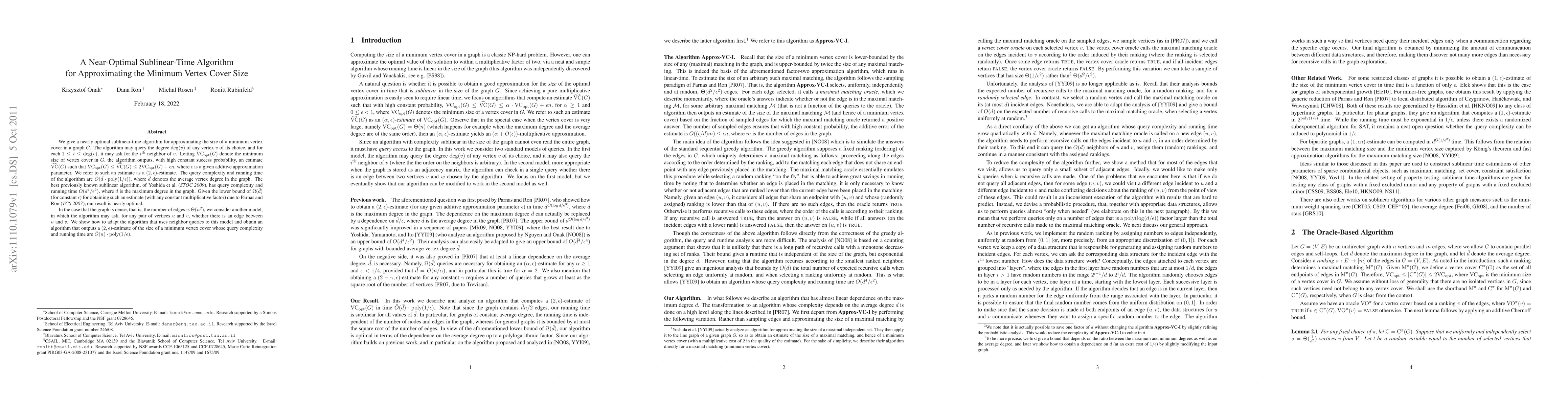 This paper presents a nearly optimal sublinear-time algorithm for approximating the minimum vertex cover size in a graph, achieving a (2,epsilon)-estimate with query complexity and running time of ~O(avg_deg * poly(1/epsilon)). The algorithm adapts to dense graphs, providing an alternative model with edge queries that maintains a similar efficiency.
