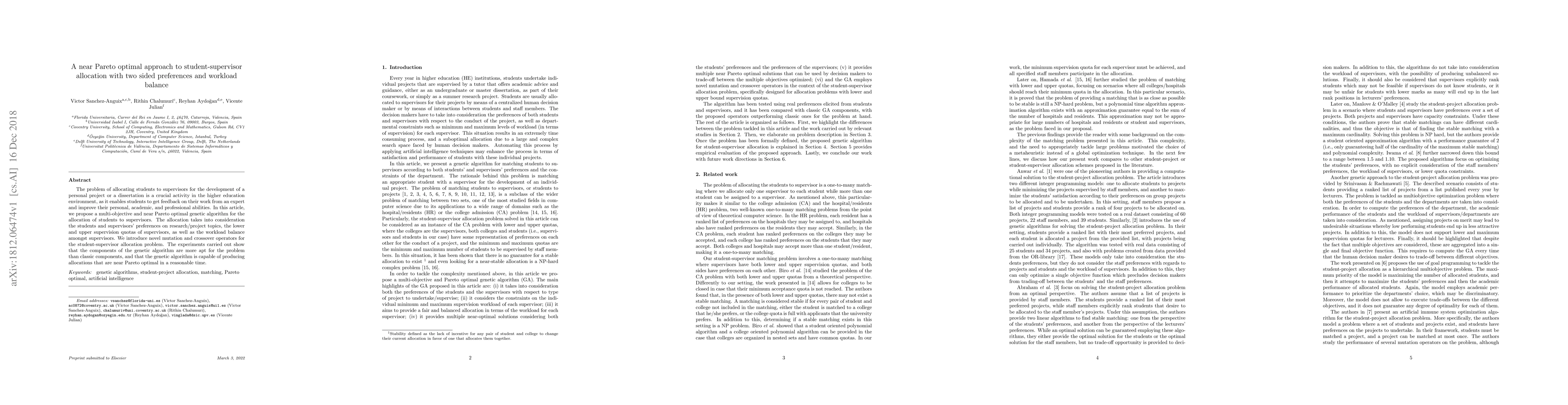 This paper proposes a multi-objective genetic algorithm for student-supervisor allocation, considering preferences and workload balance, and introduces novel operators. The algorithm produces near Pareto optimal allocations efficiently, outperforming classic components in experiments.