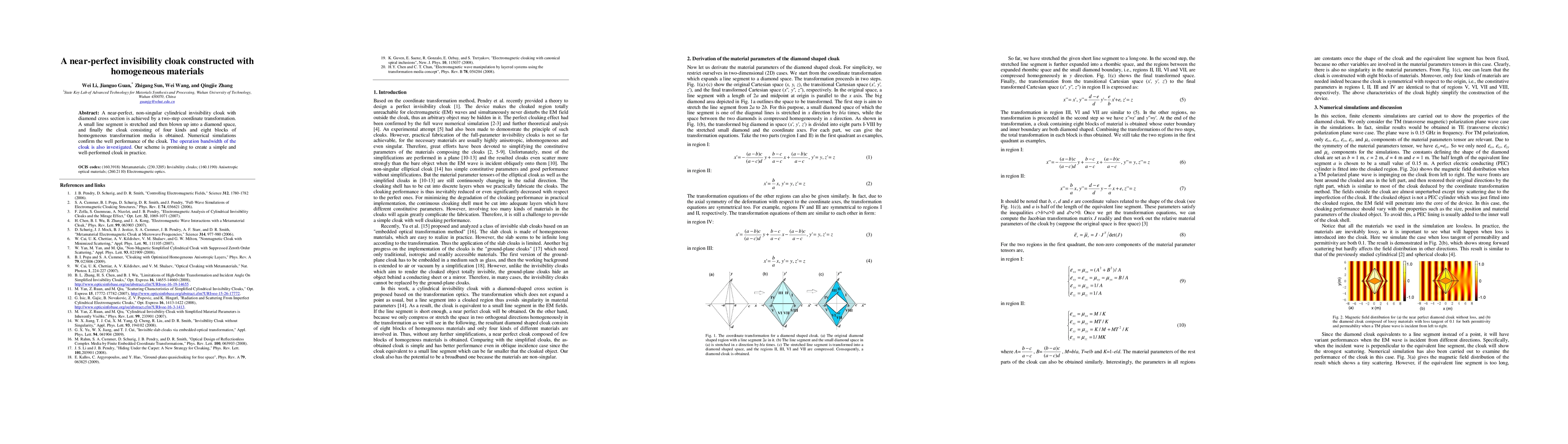 This research develops a near-perfect invisibility cloak using homogeneous materials achieved through a two-step coordinate transformation. Numerical simulations validate its performance and operational bandwidth, suggesting practical potential for cloak creation.