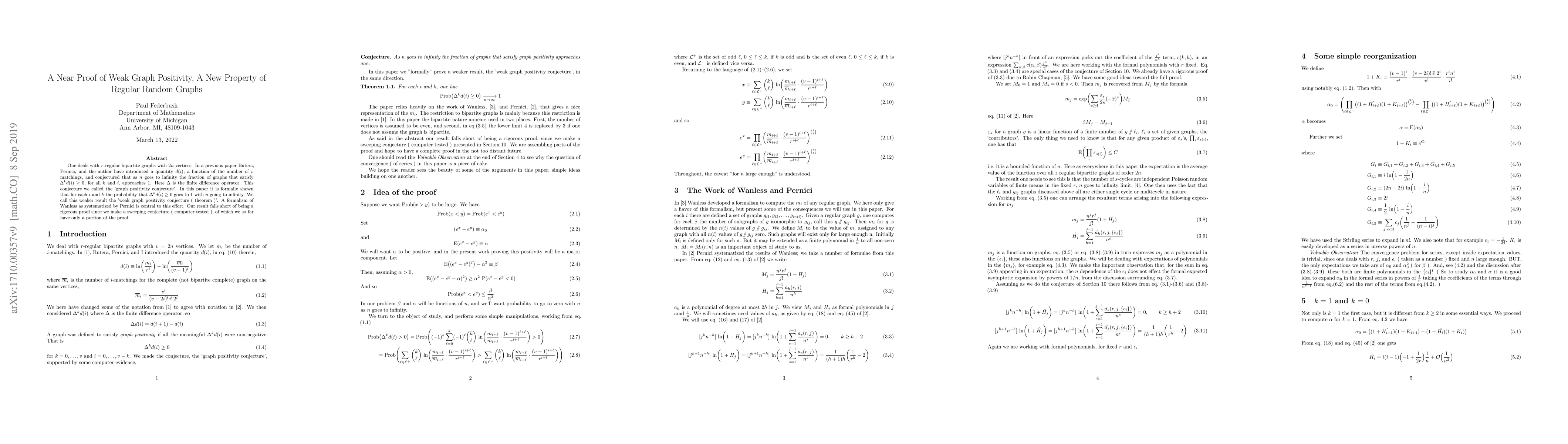 One deals with r-regular bipartite graphs with 2n vertices. In a previous paper Butera, Pernici, and the author have introduced a quantity d(i), a function of the number of i-matchings, and conjectured that as n goes to infinity the fraction of graphs that satisfy Delta^k d(i) for all k and i, approaches 1. Here Delta is the finite difference operator. This conjecture we called the 'graph positivity conjecture'. In this paper it is formally shown that for each i and k the probability that Delta^k d(i) goes to 1 with n going to infinity. We call this weaker result the 'weak graph positivity conjecture ( theorem )'. A formalism of Wanless as systematized by Pernici is central to this effort. Our result falls short of being a rigorous proof since we make a sweeping conjecture ( computer tested ), of which we so far have only a portion of the proof.