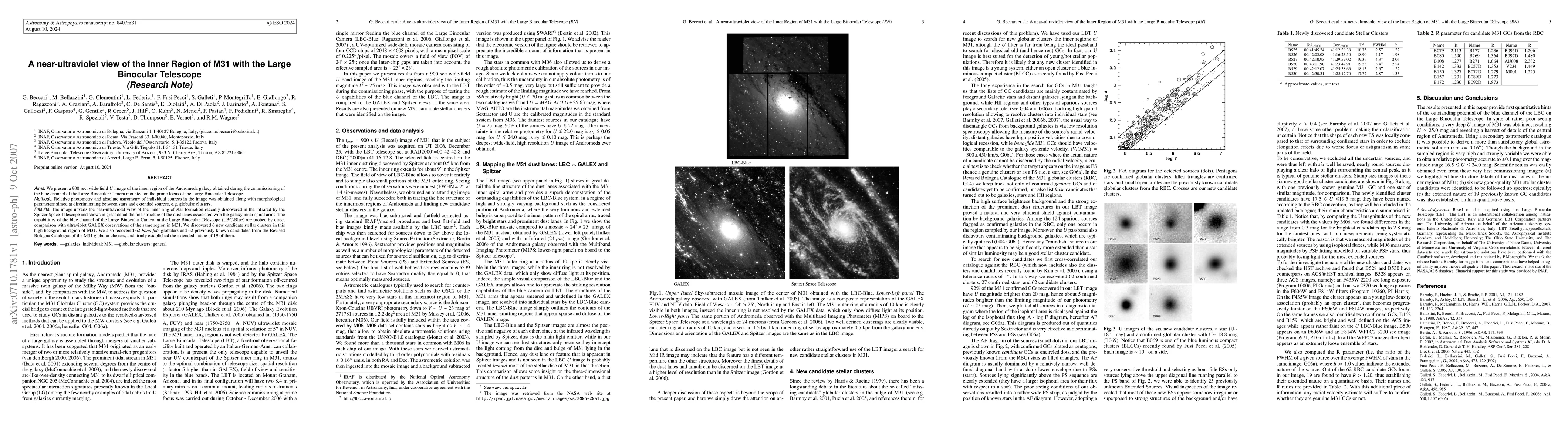 This study presents a detailed near-ultraviolet image of the inner region of the Andromeda galaxy using the Large Binocular Telescope, revealing the inner ring of star formation and the structure of dust lanes. The research identified 6 new candidate stellar clusters and confirmed the extended nature of 19 globular clusters.