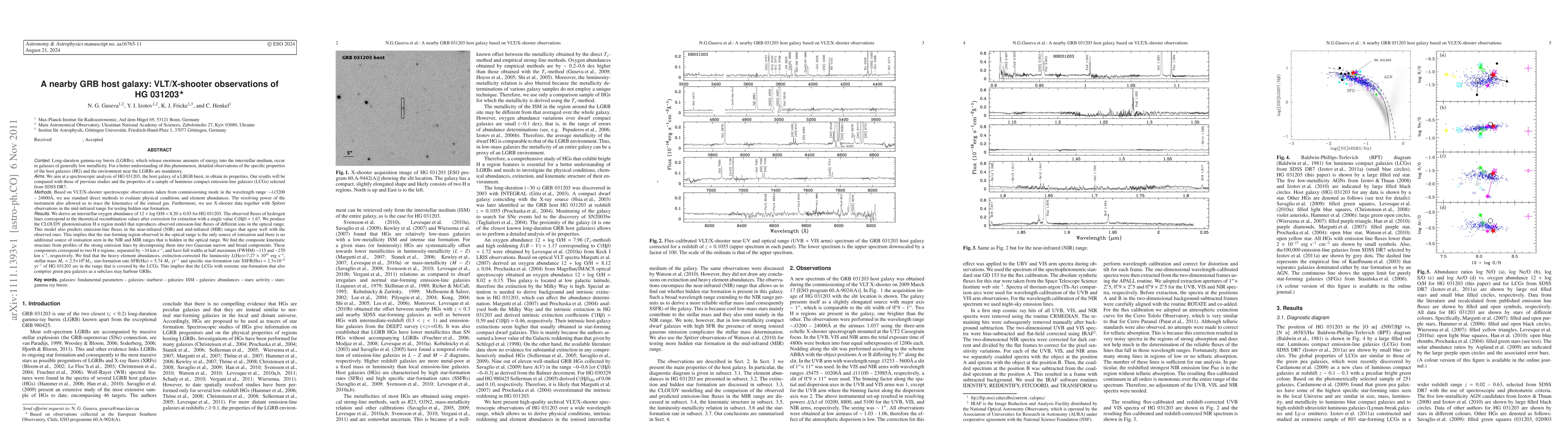 (abridged) Long-duration gamma-ray bursts (LGRBs) occur in galaxies of generally low metallicity. We aim at a spectroscopic analysis of HG 031203, the host galaxy of a LRGB burst, to obtain its properties. Based on VLT/X-shooter spectroscopic observations in the wavelength range 3200-24000A, we use standard direct methods to evaluate physical conditions and element abundances. The resolving power of the instrument also allowed us to trace the kinematics of the ionised gas. We derive an interstellar oxygen abundance of 12+logO/H=8.20+/-0.03. The observed fluxes of hydrogen lines correspond to the theoretical recombination values after correction for extinction with a single value C(Hbeta)=1.67. We produce the CLOUDY photoionisation HII region model that reproduces observed emission-line fluxes of different ions in the optical range. This model also predicts emission-line fluxes in the near-infrared (NIR) and mid-infrared (MIR) ranges that agree well with the observed ones. This implies that the star-forming region observed in the optical range is the only source of ionisation and there is no additional source of ionisation seen in the NIR and MIR ranges that is hidden in the optical range.We find that the heavy element abundances, Halpha luminosity, stellar mass, star-formation rate and specific star-formation rate of HG 031203 are in the range that is covered by the luminous compact galaxies (LCGs).This implies that the LCGs with extreme star-formation that also comprise green pea galaxies as a subclass may harbour LGRBs.