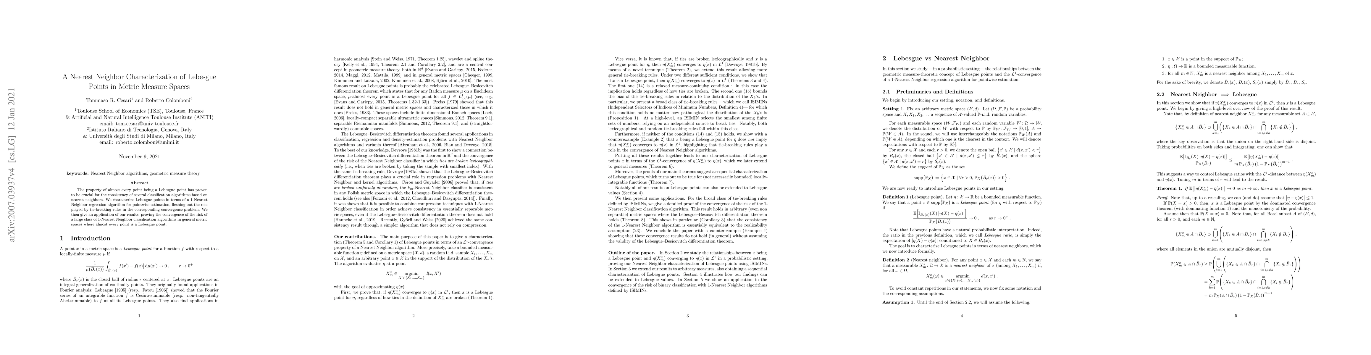 This paper characterizes Lebesgue points in metric measure spaces using a 1-Nearest Neighbor regression algorithm, emphasizing the role of tie-breaking rules in convergence. It demonstrates the convergence of a broad class of 1-Nearest Neighbor classification algorithms under these conditions.