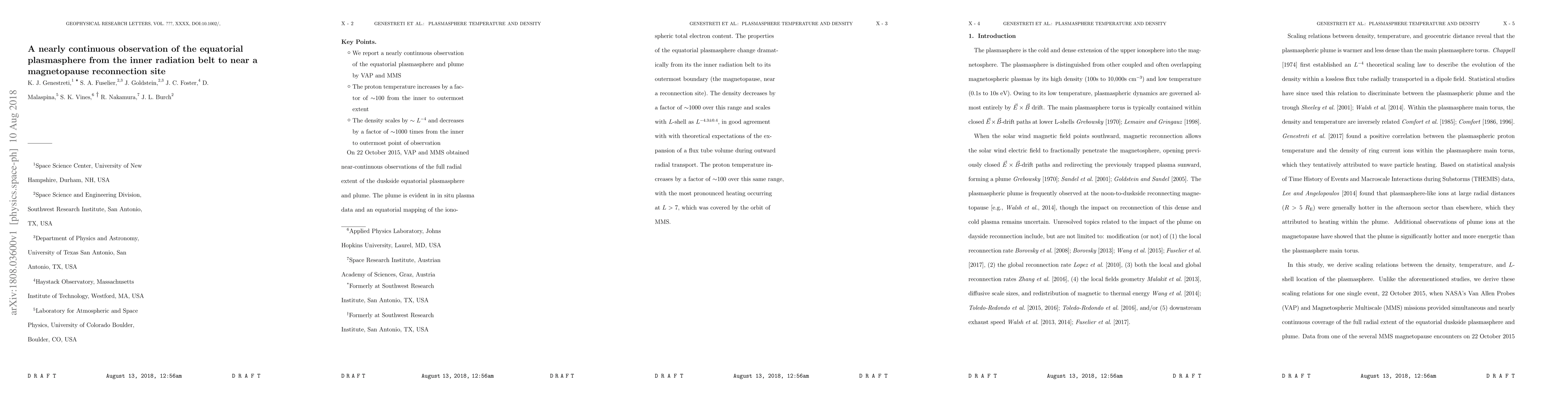 On 22 October 2015, VAP and MMS obtained near-continuous observations of the full radial extent of the duskside equatorial plasmasphere and plume. The plume is evident in in situ plasma data and an equatorial mapping of the ionospheric total electron content. The properties of the equatorial plasmasphere change dramatically from its the inner radiation belt to its outermost boundary (the magnetopause, near a reconnection site). The density decreases by a factor of $\sim$1000 over this range and scales with $L$-shell as $L^{-4.3\pm0.4}$, in good agreement with with theoretical expectations of the expansion of a flux tube volume during outward radial transport. The proton temperature increases by a factor of $\sim$100 over this same range, with the most pronounced heating occurring at $L>7$, which was covered by the orbit of MMS.
