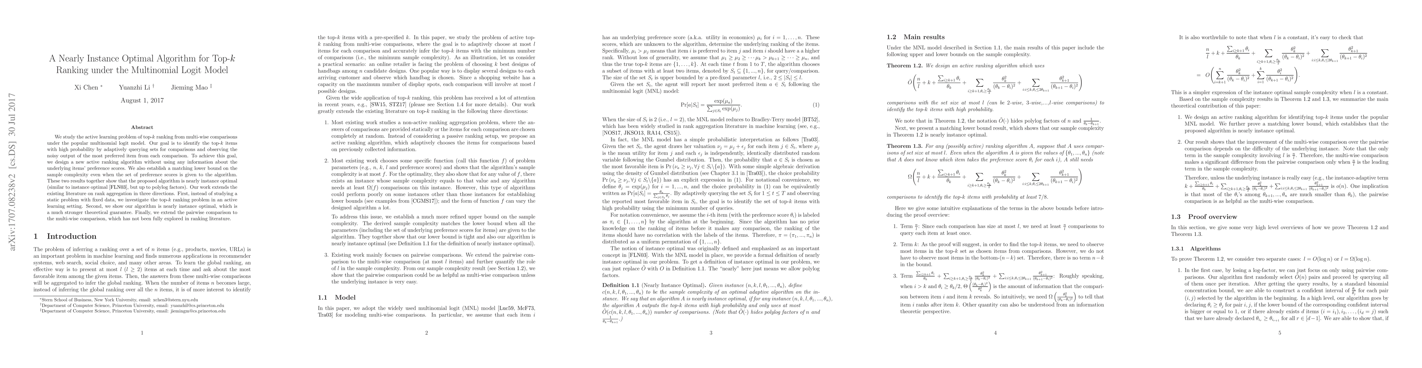 This paper proposes a new active learning algorithm for top-$k$ ranking under the multinomial logit model, demonstrating nearly instance optimal performance and extending the literature by incorporating multi-wise comparisons instead of just pairwise. The algorithm adaptively queries comparisons without prior knowledge of preference scores.