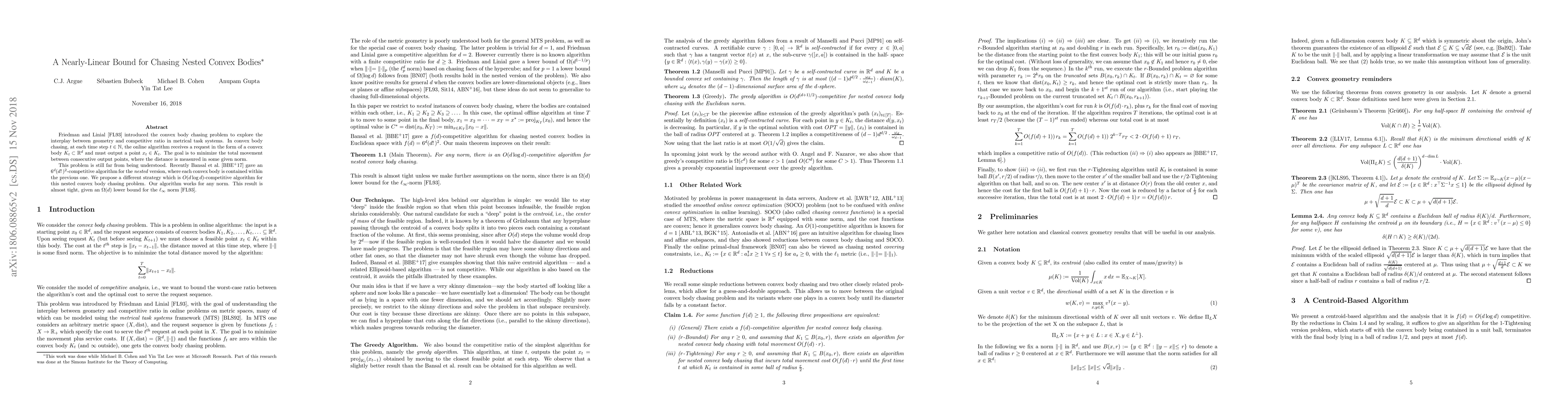 Friedman and Linial introduced the convex body chasing problem to explore the interplay between geometry and competitive ratio in metrical task systems. In convex body chasing, at each time step $t \in \mathbb{N}$, the online algorithm receives a request in the form of a convex body $K_t \subseteq \mathbb{R}^d$ and must output a point $x_t \in K_t$. The goal is to minimize the total movement between consecutive output points, where the distance is measured in some given norm. This problem is still far from being understood, and recently Bansal et al. gave an algorithm for the nested version, where each convex body is contained within the previous one. We propose a different strategy which is $O(d \log d)$-competitive algorithm for this nested convex body chasing problem, improving substantially over previous work. Our algorithm works for any norm. This result is almost tight, given an $\Omega(d)$ lower bound for the $\ell_{\infty}$.