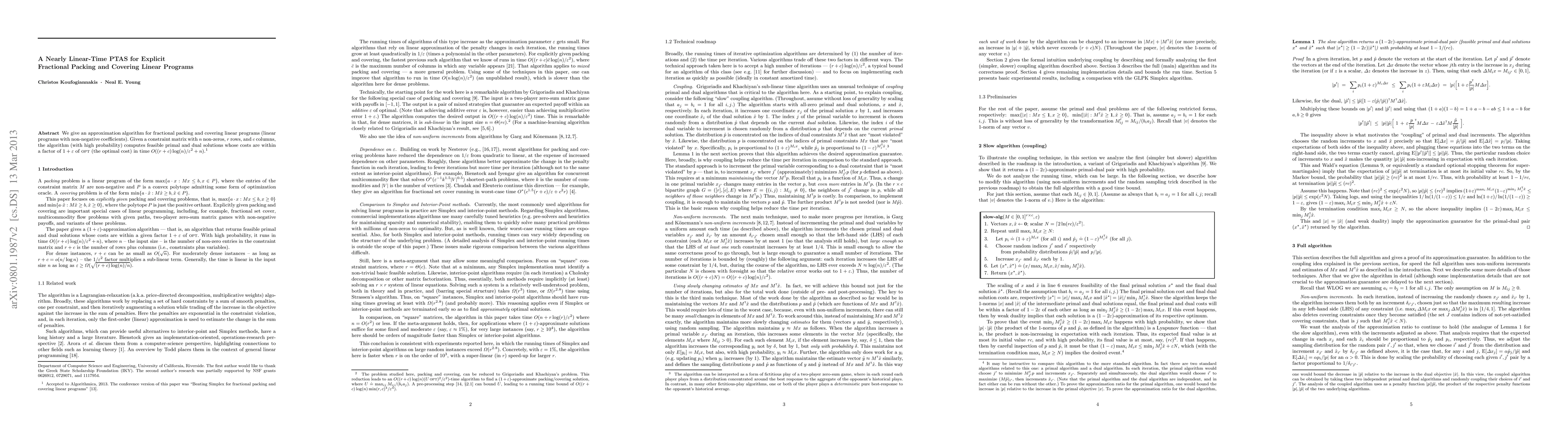 This paper presents a nearly linear-time Polynomial Time Approximation Scheme (PTAS) for solving packing and covering linear programs, achieving feasible primal and dual solutions within a factor of 1+eps of the optimal cost in O((r+c)log(n)/eps^2 + n) time.