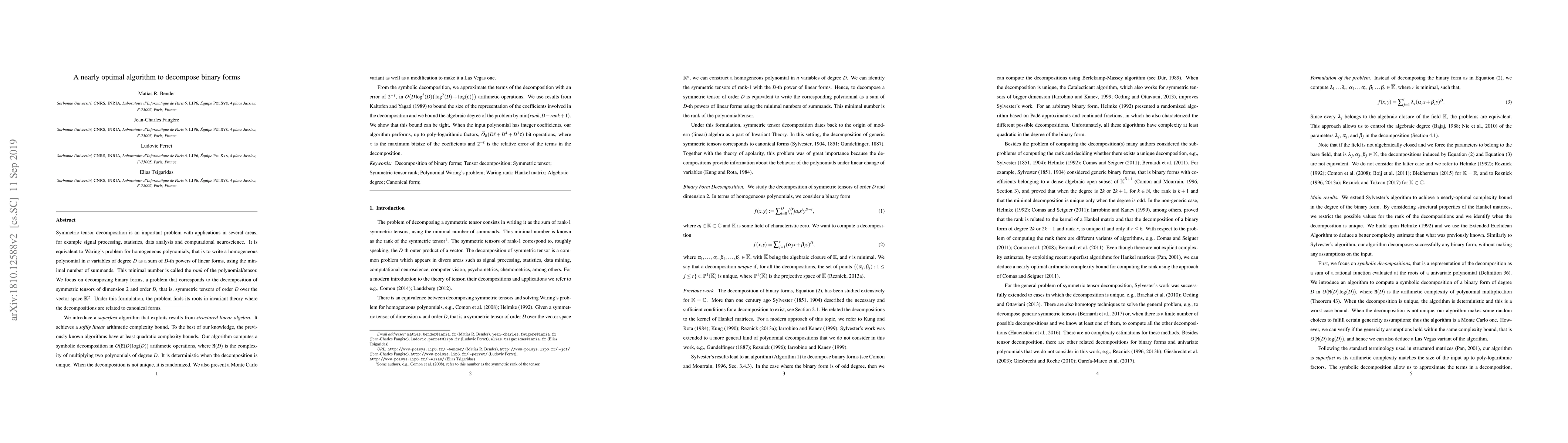 Symmetric tensor decomposition is an important problem with applications in several areas for example signal processing, statistics, data analysis and computational neuroscience. It is equivalent to Waring's problem for homogeneous polynomials, that is to write a homogeneous polynomial in n variables of degree D as a sum of D-th powers of linear forms, using the minimal number of summands. This minimal number is called the rank of the polynomial/tensor. We focus on decomposing binary forms, a problem that corresponds to the decomposition of symmetric tensors of dimension 2 and order D. Under this formulation, the problem finds its roots in invariant theory where the decompositions are known as canonical forms. In this context many different algorithms were proposed. We introduce a superfast algorithm that improves the previous approaches with results from structured linear algebra. It achieves a softly linear arithmetic complexity bound. To the best of our knowledge, the previously known algorithms have at least quadratic complexity bounds. Our algorithm computes a symbolic decomposition in $O(M(D) log(D))$ arithmetic operations, where $M(D)$ is the complexity of multiplying two polynomials of degree D. It is deterministic when the decomposition is unique. When the decomposition is not unique, our algorithm is randomized. We present a Monte Carlo version of it and we show how to modify it to a Las Vegas one, within the same complexity. From the symbolic decomposition, we approximate the terms of the decomposition with an error of $2^{--$\epsilon$}$ , in $O(D log^2(D) (log^2(D) + log($\epsilon$)))$ arithmetic operations. We use results from Kaltofen and Yagati (1989) to bound the size of the representation of the coefficients involved in the decomposition and we bound the algebraic degree of the problem by min(rank, D -- rank + 1). We show that this bound can be tight. When the input polynomial has integer coefficients, our algorithm performs, up to poly-logarithmic factors, $O\_{bit} (D{\ell} + D^4 + D^3 $\tau$)$ bit operations, where $$\tau$$ is the maximum bitsize of the coefficients and $2^{--{\ell}}$ is the relative error of the terms in the decomposition.