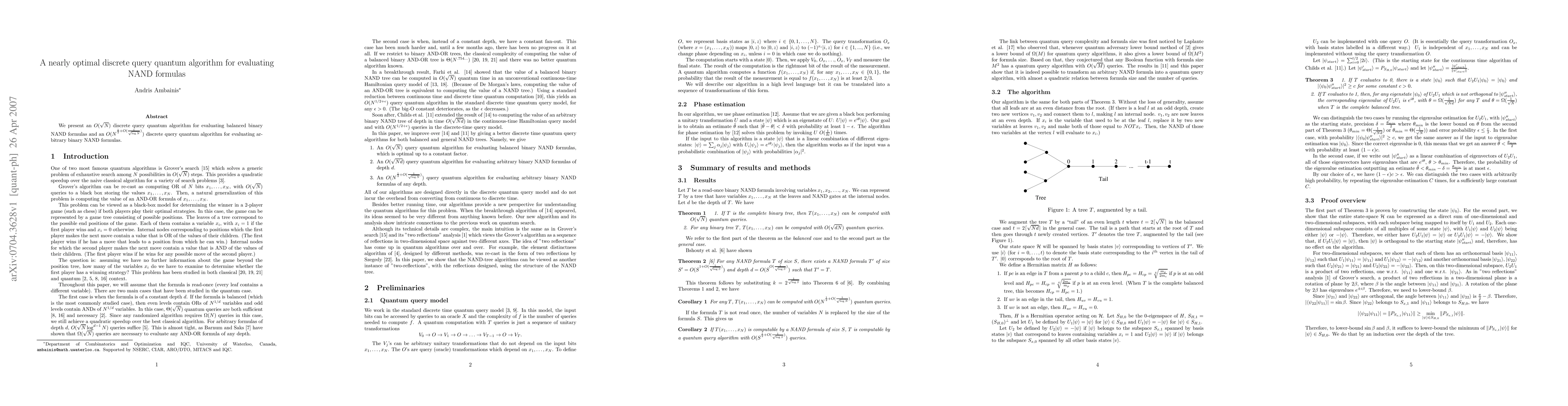We present an O(\sqrt{N}) discrete query quantum algorithm for evaluating balanced binary NAND formulas and an O(N^{{1/2}+O(\frac{1}{\sqrt{\log N}})}) discrete query quantum algorithm for evaluating arbitrary binary NAND formulas.