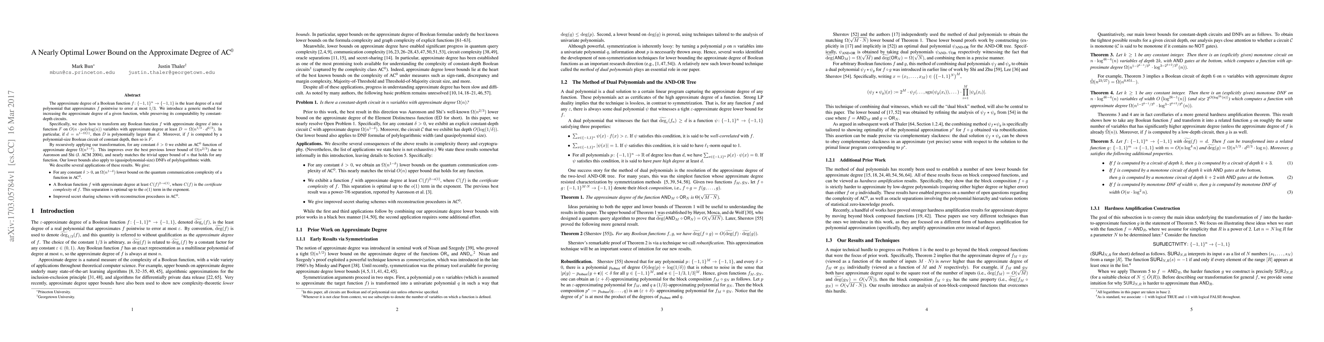 The approximate degree of a Boolean function $f \colon \{-1, 1\}^n \rightarrow \{-1, 1\}$ is the least degree of a real polynomial that approximates $f$ pointwise to error at most $1/3$. We introduce a generic method for increasing the approximate degree of a given function, while preserving its computability by constant-depth circuits. Specifically, we show how to transform any Boolean function $f$ with approximate degree $d$ into a function $F$ on $O(n \cdot \operatorname{polylog}(n))$ variables with approximate degree at least $D = \Omega(n^{1/3} \cdot d^{2/3})$. In particular, if $d= n^{1-\Omega(1)}$, then $D$ is polynomially larger than $d$. Moreover, if $f$ is computed by a polynomial-size Boolean circuit of constant depth, then so is $F$. By recursively applying our transformation, for any constant $\delta > 0$ we exhibit an AC$^0$ function of approximate degree $\Omega(n^{1-\delta})$. This improves over the best previous lower bound of $\Omega(n^{2/3})$ due to Aaronson and Shi (J. ACM 2004), and nearly matches the trivial upper bound of $n$ that holds for any function. Our lower bounds also apply to (quasipolynomial-size) DNFs of polylogarithmic width. We describe several applications of these results. We give: * For any constant $\delta > 0$, an $\Omega(n^{1-\delta})$ lower bound on the quantum communication complexity of a function in AC$^0$. * A Boolean function $f$ with approximate degree at least $C(f)^{2-o(1)}$, where $C(f)$ is the certificate complexity of $f$. This separation is optimal up to the $o(1)$ term in the exponent. * Improved secret sharing schemes with reconstruction procedures in AC$^0$.