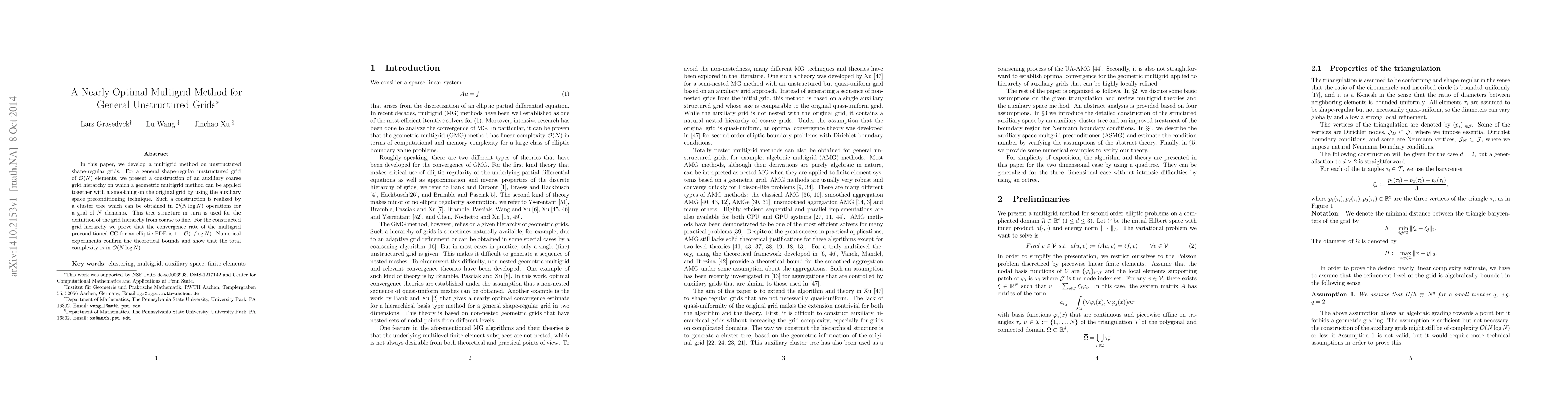 In this paper, we develop a multigrid method on unstructured shape-regular grids. For a general shape-regular unstructured grid of ${\cal O}(N)$ elements, we present a construction of an auxiliary coarse grid hierarchy on which a geometric multigrid method can be applied together with a smoothing on the original grid by using the auxiliary space preconditioning technique. Such a construction is realized by a cluster tree which can be obtained in ${\cal O}(N\log N)$ operations for a grid of $N$ elements. This tree structure in turn is used for the definition of the grid hierarchy from coarse to fine. For the constructed grid hierarchy we prove that the convergence rate of the multigrid preconditioned CG for an elliptic PDE is $1 - {\cal O}({1}/{\log N})$. Numerical experiments confirm the theoretical bounds and show that the total complexity is in ${\cal O}(N\log N)$.