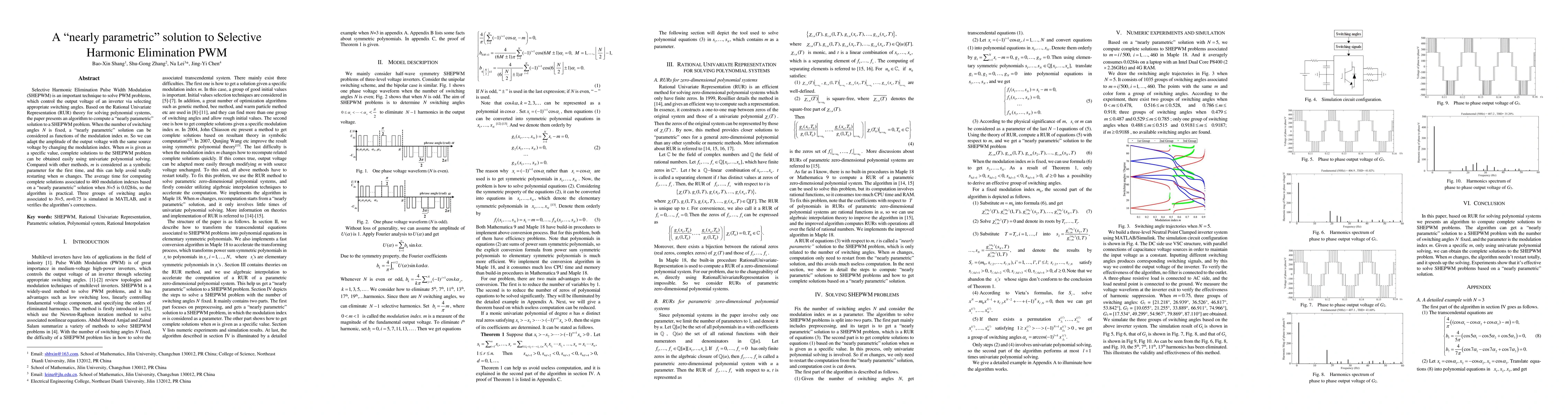 This paper proposes a "nearly parametric" solution to Selective Harmonic Elimination Pulse Width Modulation (SHEPWM) using Rational Univariate Representation theory. The algorithm computes switching angles as functions of the modulation index, enabling adaptive output voltage control without restarting computations when the modulation index changes, demonstrating practical efficiency with a computation time of 0.0284s for 460 modulation indexes when N=5.