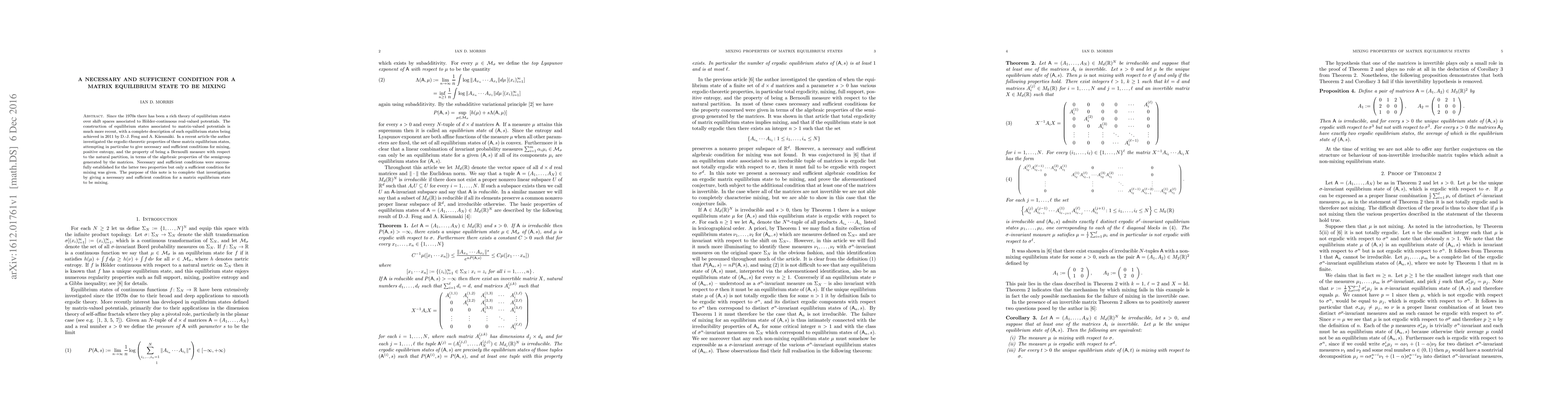 Since the 1970s there has been a rich theory of equilibrium states over shift spaces associated to H\"older-continuous real-valued potentials. The construction of equilibrium states associated to matrix-valued potentials is much more recent, with a complete description of such equilibrium states being achieved in 2011 by D.-J. Feng and A. K\"aenm\"aki. In a recent article the author investigated the ergodic-theoretic properties of these matrix equilibrium states, attempting in particular to give necessary and sufficient conditions for mixing, positive entropy, and the property of being a Bernoulli measure with respect to the natural partition, in terms of the algebraic properties of the semigroup generated by the matrices. Necessary and sufficient conditions were successfully established for the latter two properties but only a sufficient condition for mixing was given. The purpose of this note is to complete that investigation by giving a necessary and sufficient condition for a matrix equilibrium state to be mixing.