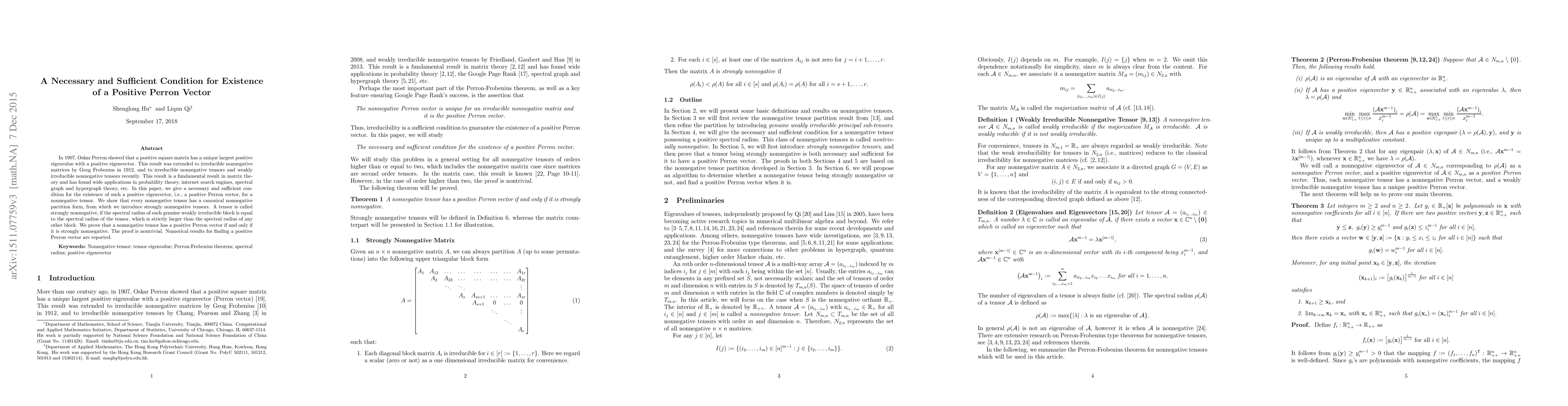 In 1907, Oskar Perron showed that a positive square matrix has a unique largest positive eigenvalue with a positive eigenvector. This result was extended to irreducible nonnegative matrices by Geog Frobenius in 1912, and to irreducible nonnegative tensors and weakly irreducible nonnegative tensors recently. This result is a fundamental result in matrix theory and has found wide applications in probability theory, internet search engines, spectral graph and hypergraph theory, etc. In this paper, we give a necessary and sufficient condition for the existence of such a positive eigenvector, i.e., a positive Perron vector, for a nonnegative tensor. We show that every nonnegative tensor has a canonical nonnegative partition form, from which we introduce strongly nonnegative tensors. A tensor is called strongly nonnegative, if the spectral radius of each genuine weakly irreducible block is equal to the spectral radius of the tensor, which is strictly larger than the spectral radius of any other block. We prove that a nonnegative tensor has a positive Perron vector if and only if it is strongly nonnegative. The proof is nontrivial. Numerical results for finding a positive Perron vector are reported.