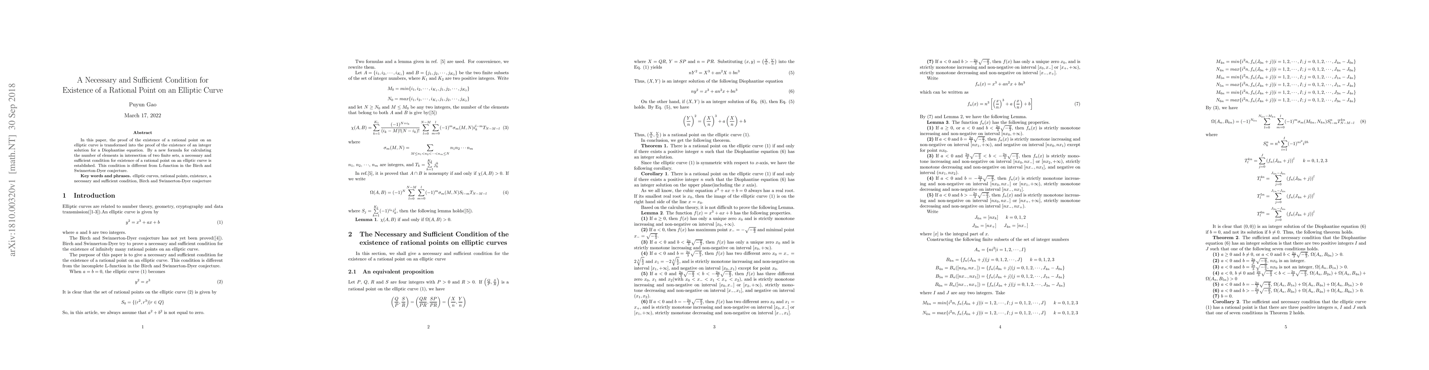 This paper establishes a necessary and sufficient condition for the existence of a rational point on an elliptic curve by transforming the problem into finding an integer solution for a Diophantine equation, using a novel formula for intersecting finite sets. This condition differs from the L-function approach in the Birch and Swinnerton-Dyer conjecture.