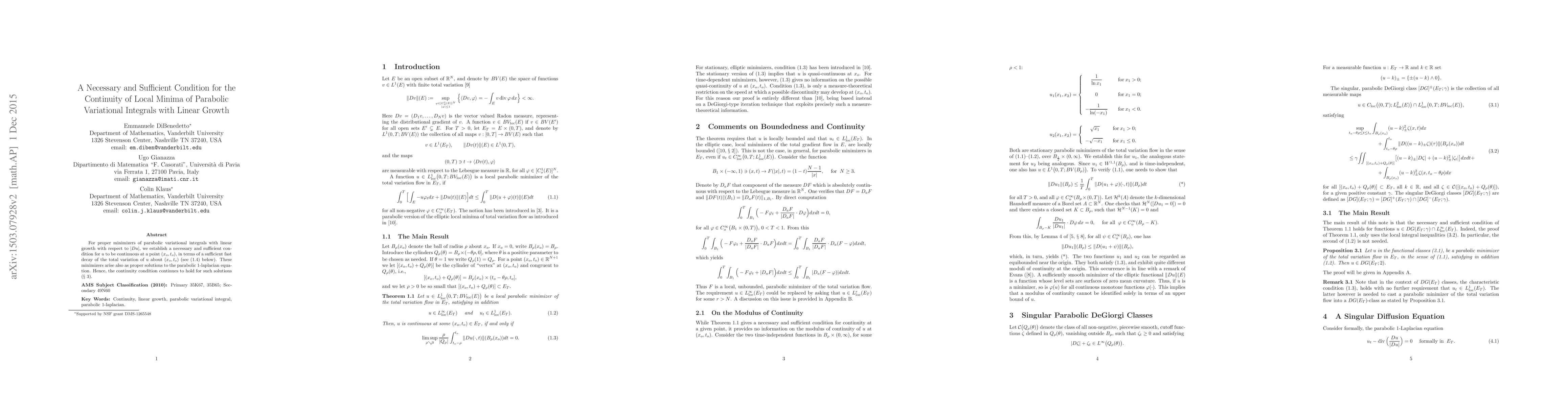 A research paper establishes a necessary and sufficient condition for the continuity of local minima of parabolic variational integrals with linear growth to hold at certain points.