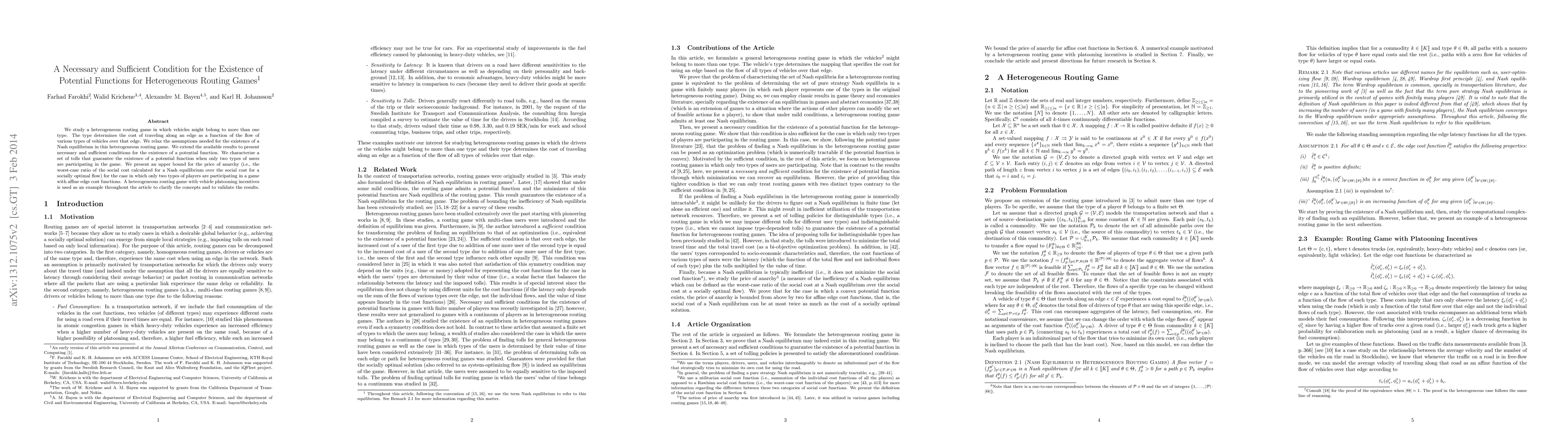 We study a heterogeneous routing game in which vehicles might belong to more than one type. The type determines the cost of traveling along an edge as a function of the flow of various types of vehicles over that edge. We relax the assumptions needed for the existence of a Nash equilibrium in this heterogeneous routing game. We extend the available results to present necessary and sufficient conditions for the existence of a potential function. We characterize a set of tolls that guarantee the existence of a potential function when only two types of users are participating in the game. We present an upper bound for the price of anarchy (i.e., the worst-case ratio of the social cost calculated for a Nash equilibrium over the social cost for a socially optimal flow) for the case in which only two types of players are participating in a game with affine edge cost functions. A heterogeneous routing game with vehicle platooning incentives is used as an example throughout the article to clarify the concepts and to validate the results.