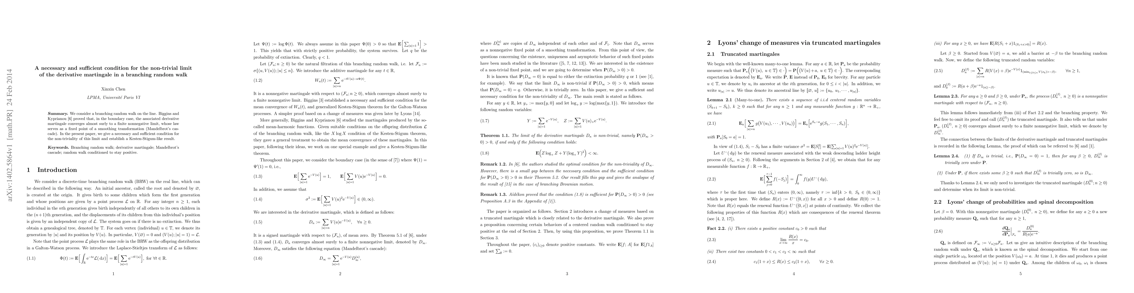 This paper establishes a necessary and sufficient condition for the non-trivial limit of the derivative martingale in a branching random walk, extending previous results by Biggins and Kyprianou, and providing a Kesten-Stigum-like result.