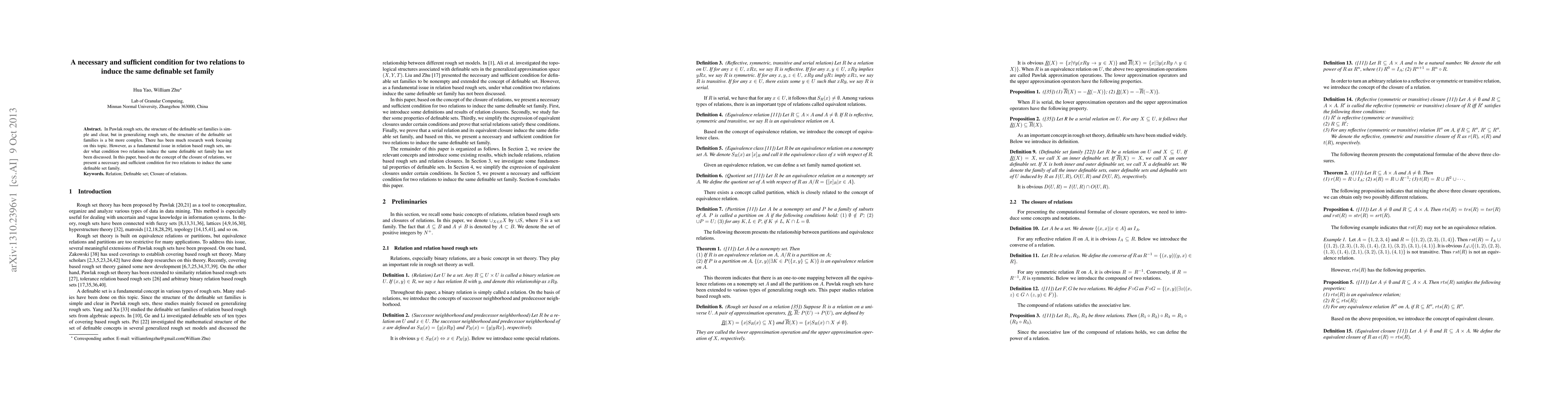 In Pawlak rough sets, the structure of the definable set families is simple and clear, but in generalizing rough sets, the structure of the definable set families is a bit more complex. There has been much research work focusing on this topic. However, as a fundamental issue in relation based rough sets, under what condition two relations induce the same definable set family has not been discussed. In this paper, based on the concept of the closure of relations, we present a necessary and sufficient condition for two relations to induce the same definable set family.