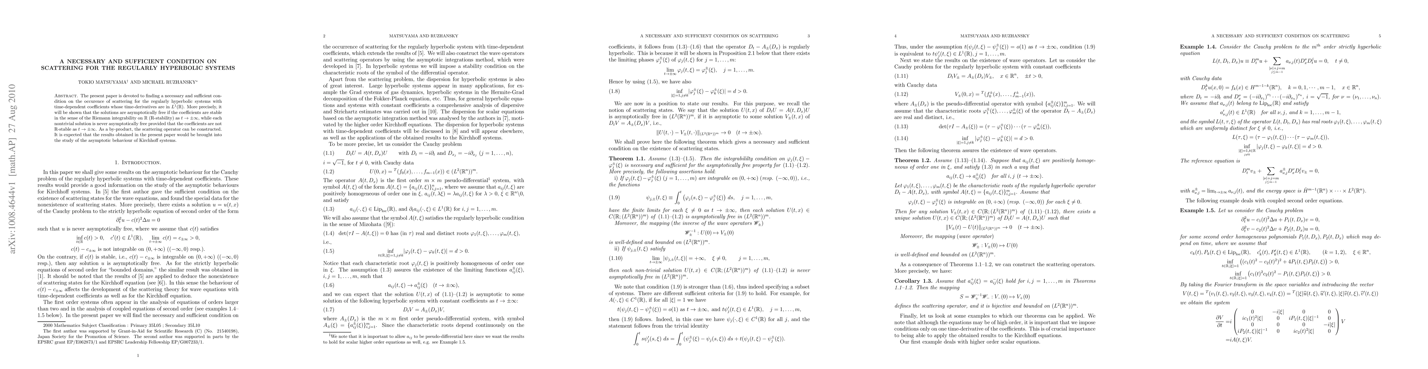 The present paper is devoted to finding a necessary and sufficient condition on the occurence of scattering for the regularly hyperbolic systems with time-dependent coefficients whose time-derivatives are integrable over the real line. More precisely, it will be shown that the solutions are asymptotically free if the coefficients are stable in the sense of the Riemann integrability as time goes to infinity, while each nontrivial solution is never asymptotically free provided that the coefficients are not R-stable as times goes to infinity. As a by-product, the scattering operator can be constructed. It is expected that the results obtained in the present paper would be brought into the study of the asymptotic behaviour of Kirchhoff systems.
