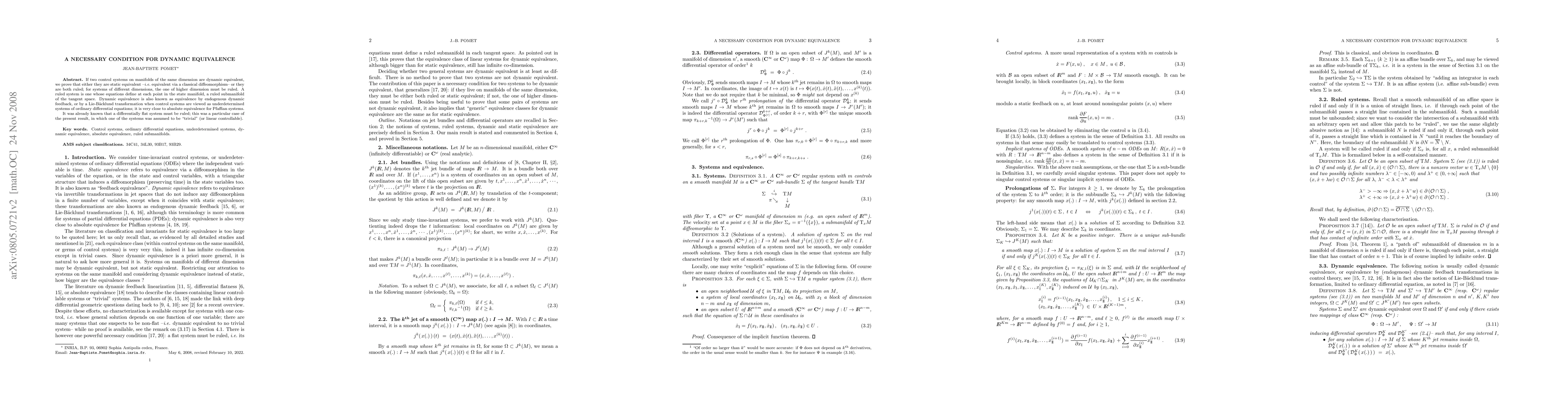 The paper establishes a necessary condition for dynamic equivalence, linking it to the concepts of static equivalence and ruled systems, thereby enriching the theoretical framework of control systems on manifolds.