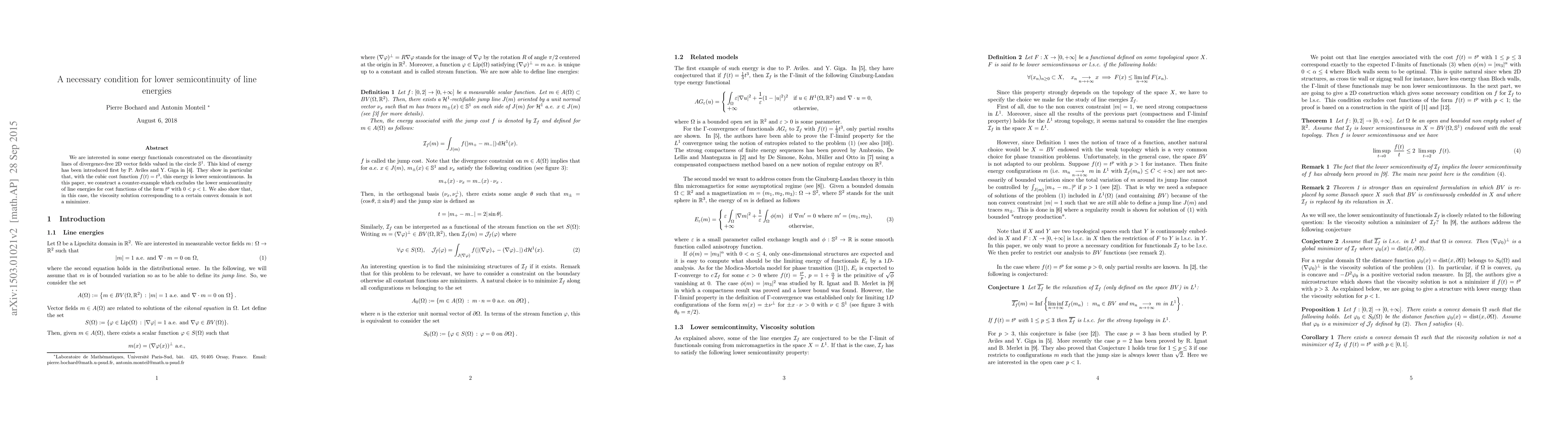 We are interested in some energy functionals concentrated on the discontinuity lines of divergence-free 2D vector fields valued in the circle $\mathbb{S}^1$. This kind of energy has been introduced first by P. Aviles and Y. Giga. They show in particular that, with the cubic cost function $f(t)=t^3$, this energy is lower semicontinuous. In this paper, we construct a counter-example which excludes the lower semicontinuity of line energies for cost functions of the form $t^p$ with $0