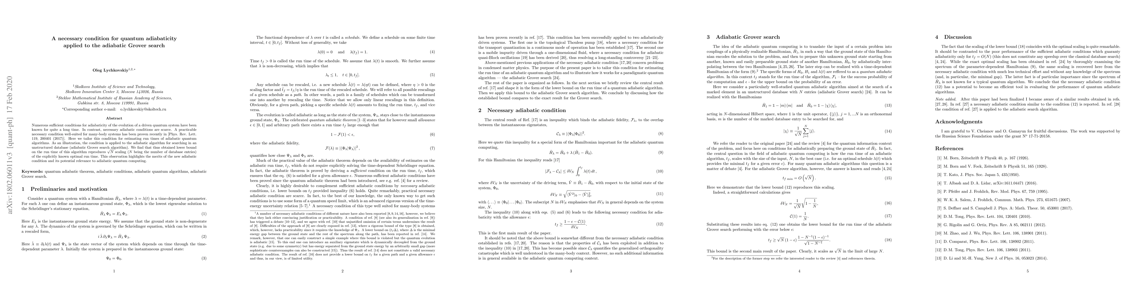 Numerous sufficient conditions for adiabaticity of the evolution of a driven quantum system have been known for quite a long time. In contrast, necessary adiabatic conditions are scarce. A practicable necessary condition well-suited for many-body systems has been proven recently in [Phys. Rev. Lett. 119, 200401 (2017)]. Here we tailor this condition for estimating run times of quantum adiabatic algorithms. As an illustration, the condition is applied to the adiabatic algorithm for searching in an unstructured database (adiabatic Grover search algorithm). We find that thus obtained lower bound on the run time of this algorithm reproduces $\sqrt N$ scaling ($N$ being the number of database entries) of the explicitly known optimal run time. This observation highlights the merits of the new adiabatic condition and its potential relevance to adiabatic quantum computing.