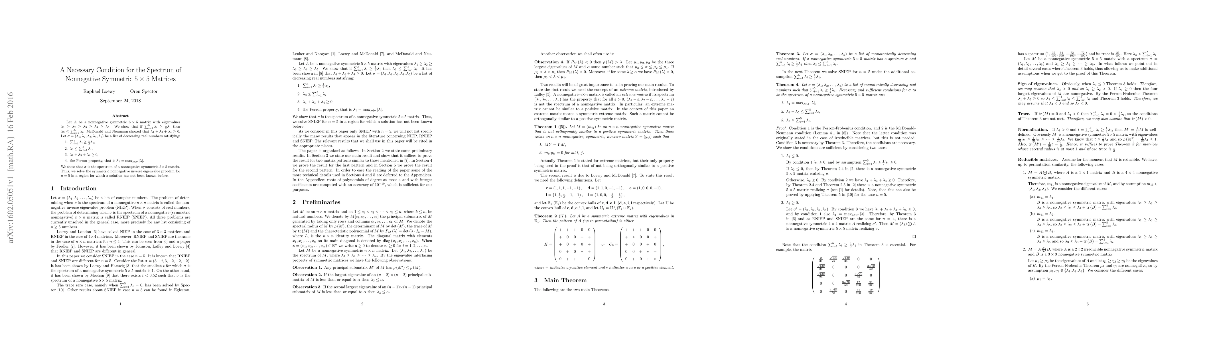 Let $A$ be a nonnegative symmetric $ 5 \times 5 $ matrix with eigenvalues $ \lambda_1 \geq \lambda_2 \geq \lambda_3 \geq \lambda_4 \geq \lambda_5 $. We show that if $ \sum_{i=1}^{5} \lambda_{i} \geq \frac{1}{2} \lambda_1 $ then $ \lambda_3 \leq \sum_{i=1}^{5} \lambda_{i} $. McDonald and Neumann showed that $ \lambda_1 + \lambda_3 + \lambda_4 \geq 0 $. Let $ \sigma = \left( \lambda_1, \lambda_2, \lambda_3, \lambda_4, \lambda_5 \right) $ be a list of decreasing real numbers satisfying: 1. $ \sum_{i=1}^{5} \lambda_{i} \geq \frac{1}{2} \lambda_1 $, 2. $ \lambda_3 \leq \sum_{i=1}^{5} \lambda_{i} $, 3. $ \lambda_1 + \lambda_3 + \lambda_4 \geq 0 $, 4. the Perron property, that is $ \lambda_1 = \max_{\lambda \in \sigma} \left| \lambda \right| $. We show that $ \sigma $ is the spectrum of a nonnegative symmetric $ 5 \times 5 $ matrix. Thus, we solve the symmetric nonnegative inverse eigenvalue problem for $ n = 5 $ in a region for which a solution has not been known before.