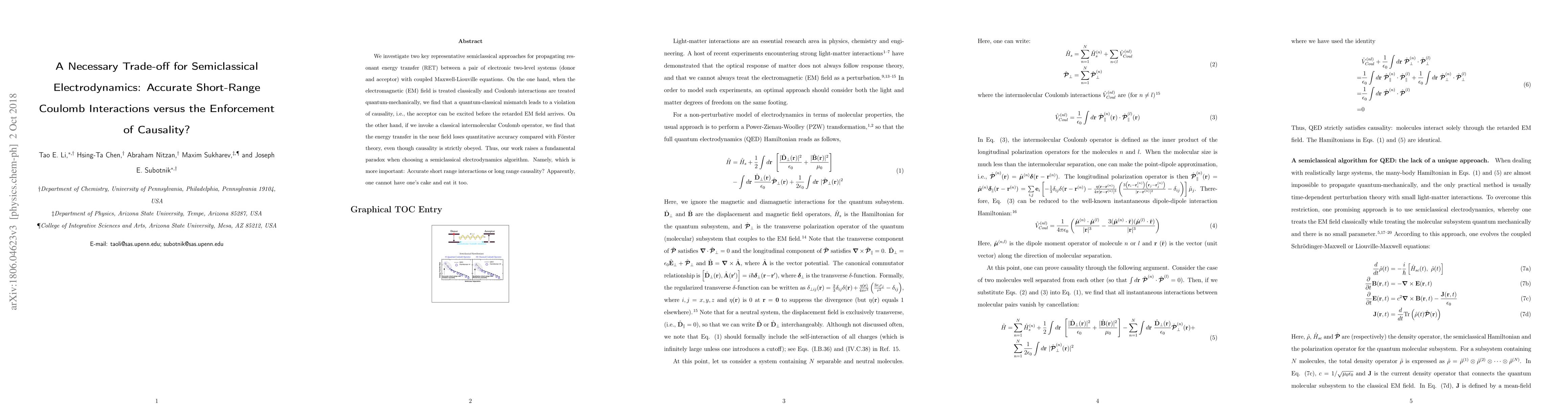 We investigate two key representative semiclassical approaches for propagating resonant energy transfer between a pair of electronic two-level systems (donor and acceptor) with coupled Maxwell-Liouville equations. On the one hand, when the electromagnetic (EM) field is treated classically and Coulomb interactions are treated quantum-mechanically, we find that a quantum-classical mismatch leads to a violation of causality, i.e., the acceptor can be excited before the retarded EM field arrives. On the other hand, if we invoke a classical intermolecular Coulomb operator, we find that the energy transfer in the near field loses quantitative accuracy compared with F\"orster theory, even though causality is strictly obeyed. Thus, our work raises a fundamental paradox when choosing a semiclassical electrodynamics algorithm. Namely, which is more important: Accurate short range interactions or long range causality? Apparently, one cannot have one's cake and eat it too.